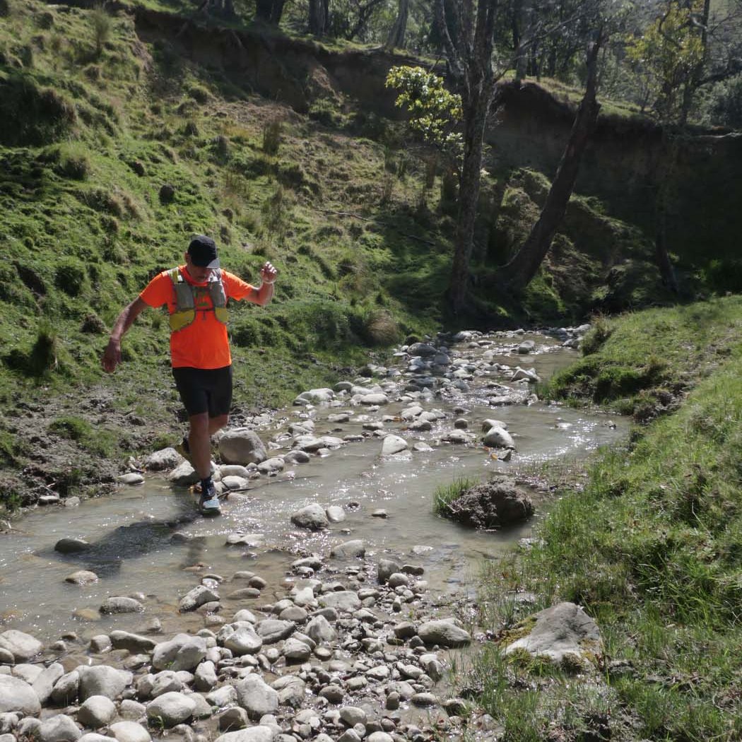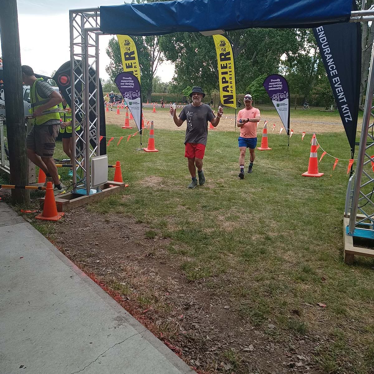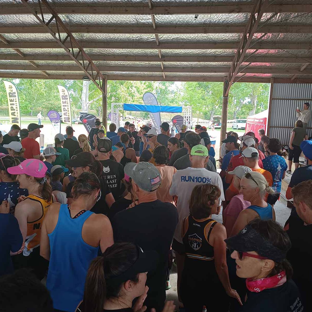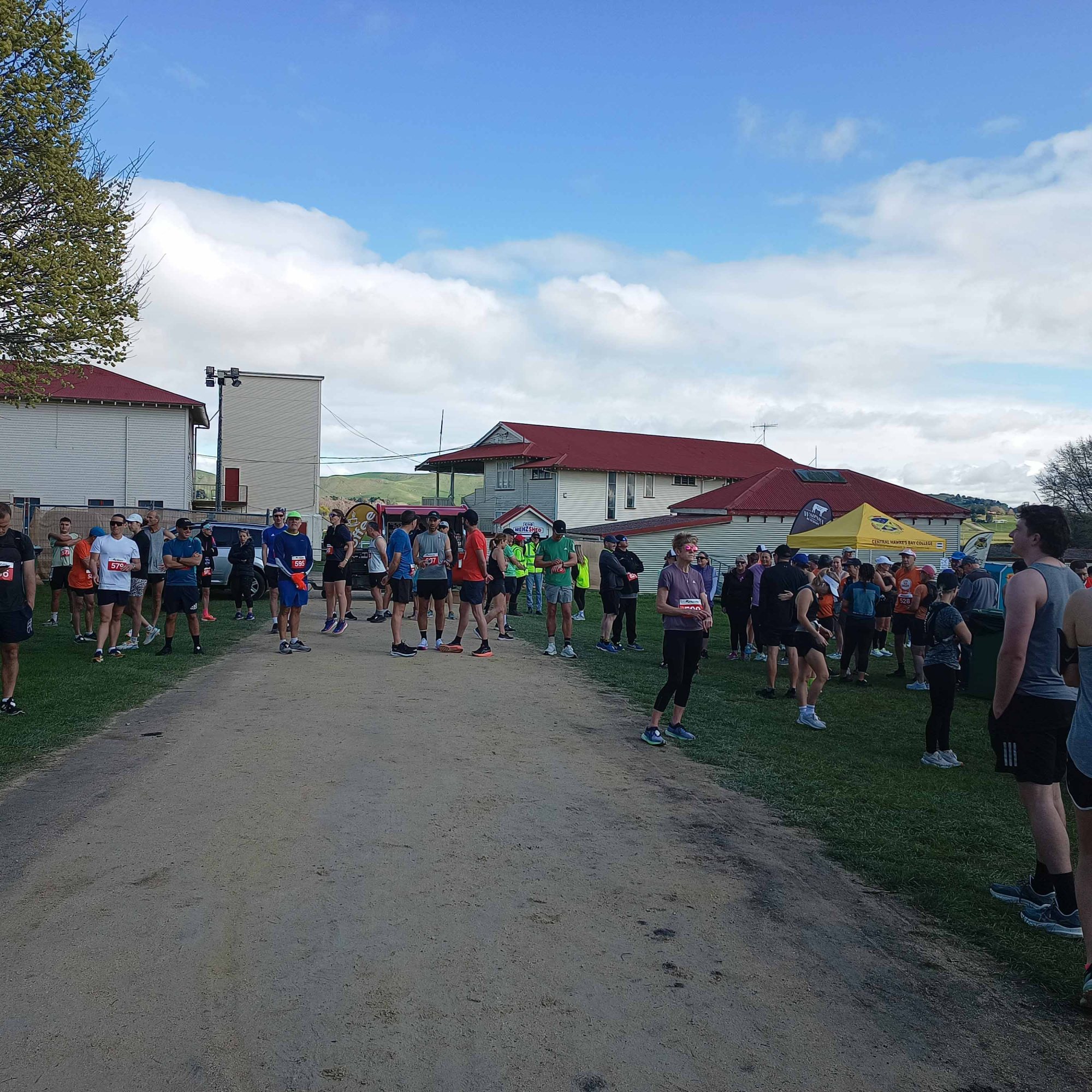 Arriving early in Waipukurao at the A&P grounds, we signed in, and got our trackers that go around your ankle to record your laps and time. Luckily the organisers used a shed for the corral where we could leave our provisions, to be close-by, stay dry, and be easily accessible between laps. We went back to the car to have breakfast and a coffee, before heading back to the shed. Chatting away, it still hadn’t sunk in that we were about to start an event. Before you know it, time was up. I still needed to make a pee stop, so went to the nearest loo. Someone was inside, taking his time, and there were two ladies in front of me. With three minutes to go, a couple of us still had to use the facility. When it finally got to my turn, there was a minute left, and I was frantically trying too pee, wipe, flush, sanitise, open door, and get back to the corral in time for the start. As the door was shutting behind me, I was still pulling up my pants, while running to the start.