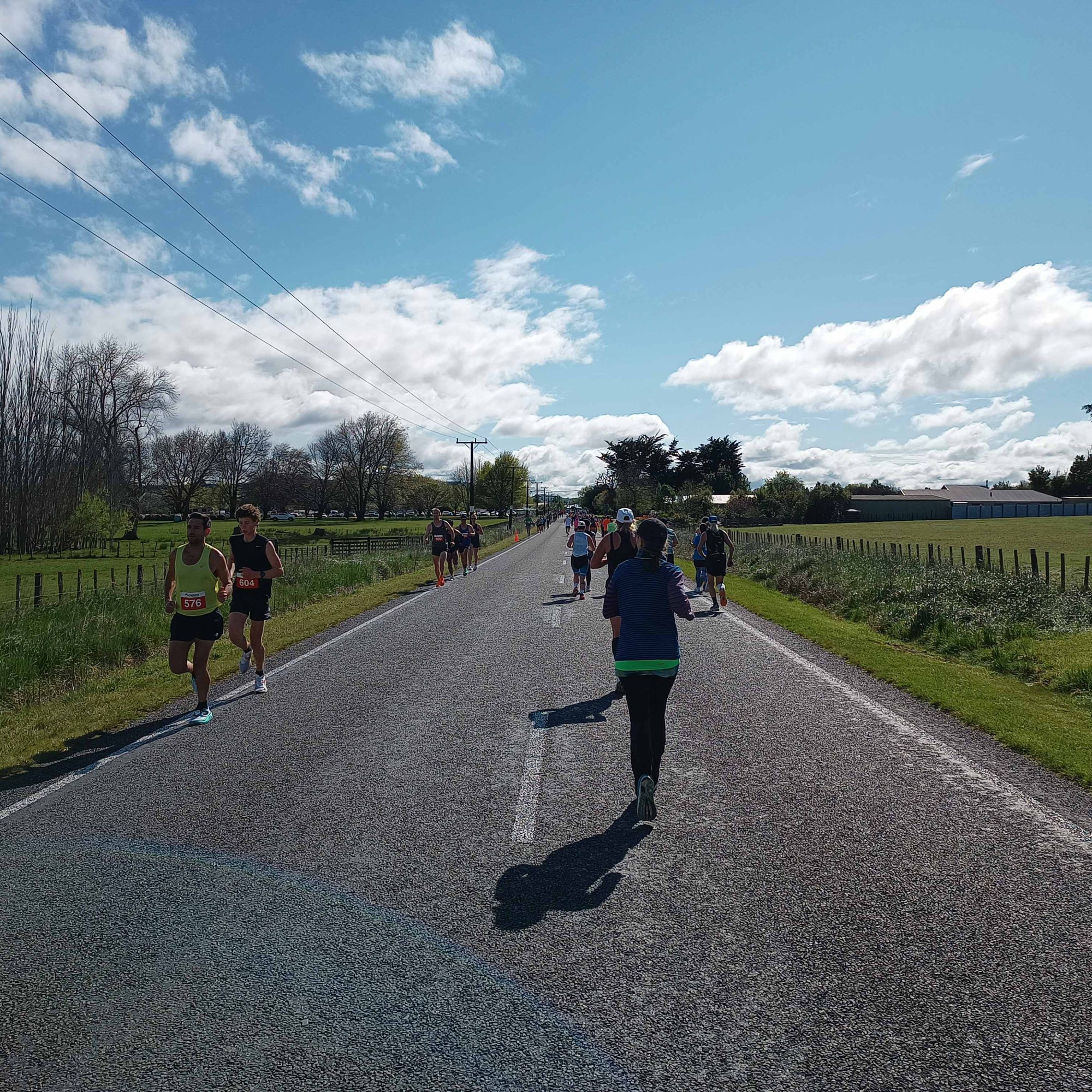 With 15 minutes to go, we lined up for race briefing, still shivering in the breeze. And then we were off. No sooner had we left the racecourse grounds, when Gerry and I found ourselves dead last. On the short out-and-back stretch in the road at the beginning, we could see everyone who took part. In the first couple of kilometres we were going at a 6:10 pace, and even though it felt reasonably comfortable, I knew I would not be able to keep it up.