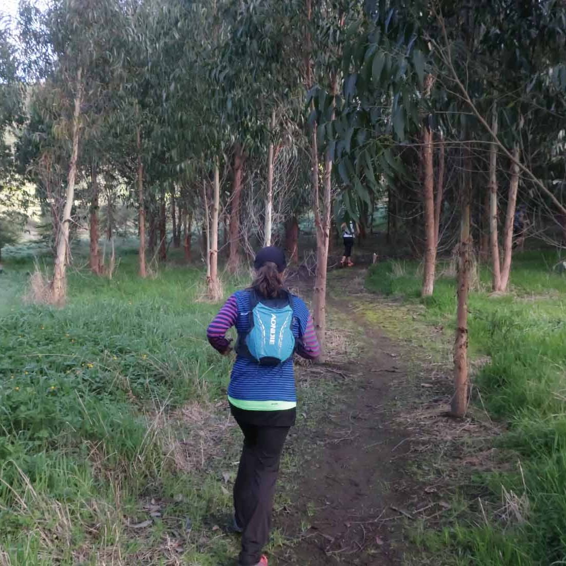 At the halfway mark (around 10km) after crossing the main road we had driven to the farm earlier, we reached an aid station. This was also the spot where the walkers would get their free lunch to have a lovely picnic under the trees. Our lunches were waiting at the finish line. We filled up our water bottles and grabbed a pear which we shared. Not long after leaving the aid station, on a very steep downhill stretch (getting down to about 75m above sea level), we saw runners scattered in all directions. It would appear that the signage might not have been obvious enough, so runners were going in all directions. Someone ahead of us spotted the arrow (looking back it seemed quite obvious), getting everyone back on track again.