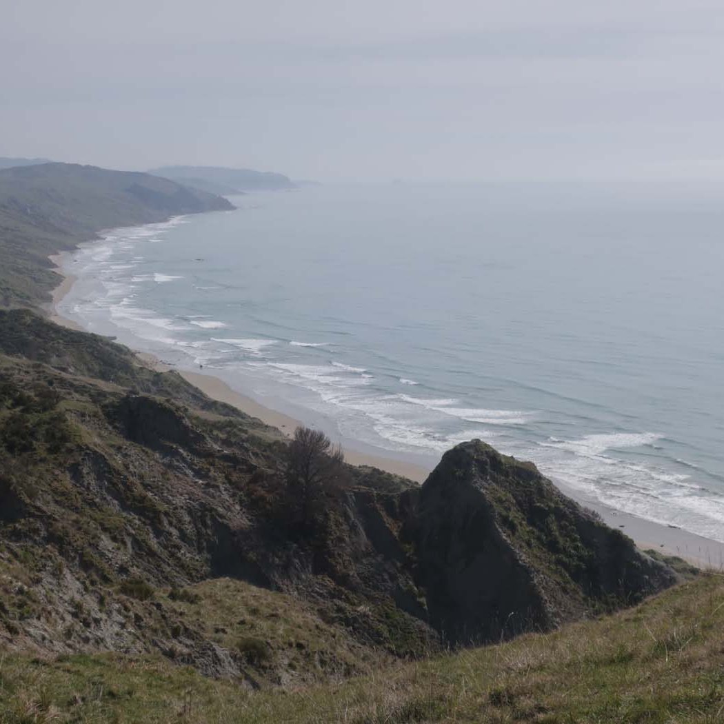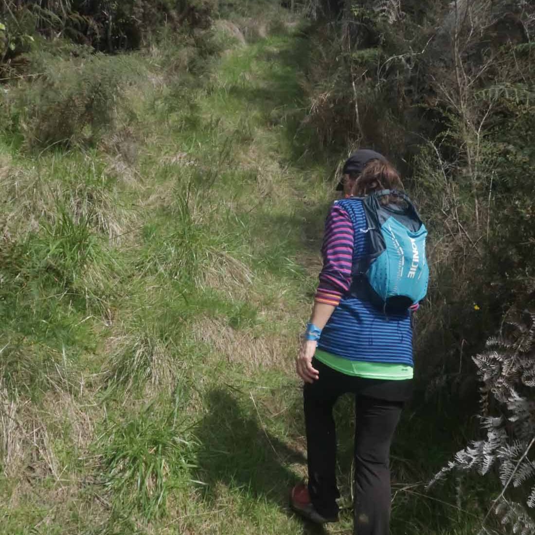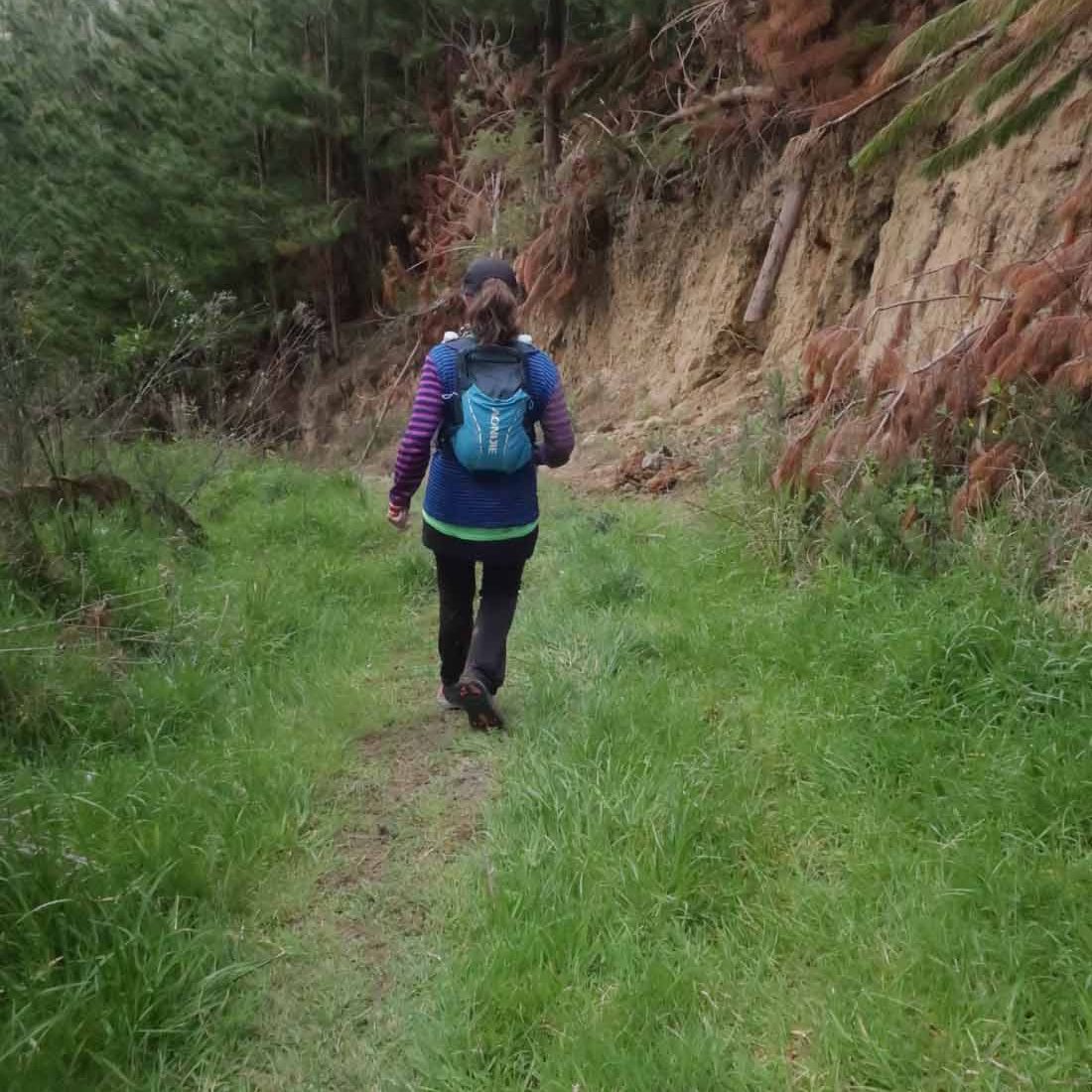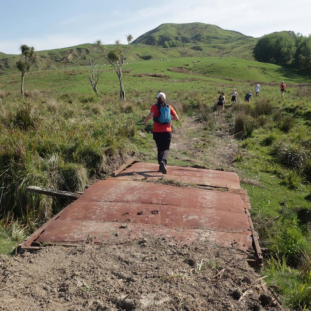 On a gradual downhill of about 5km, we constantly crossed a little stream on the farm. If one was very careful, you could keep your feet dry, and although I did manage that for the most part, I did end up dragging one foot through the water while trying to jump across. Later on I also stepped into mud. After what felt like a million stream crossings, we reached farm buildings (did I spot some ongaonga right next to it?), followed by grassy paddocks. After a gravel road crossing with some festive volunteers, and another climb, we were on our way to the beach.