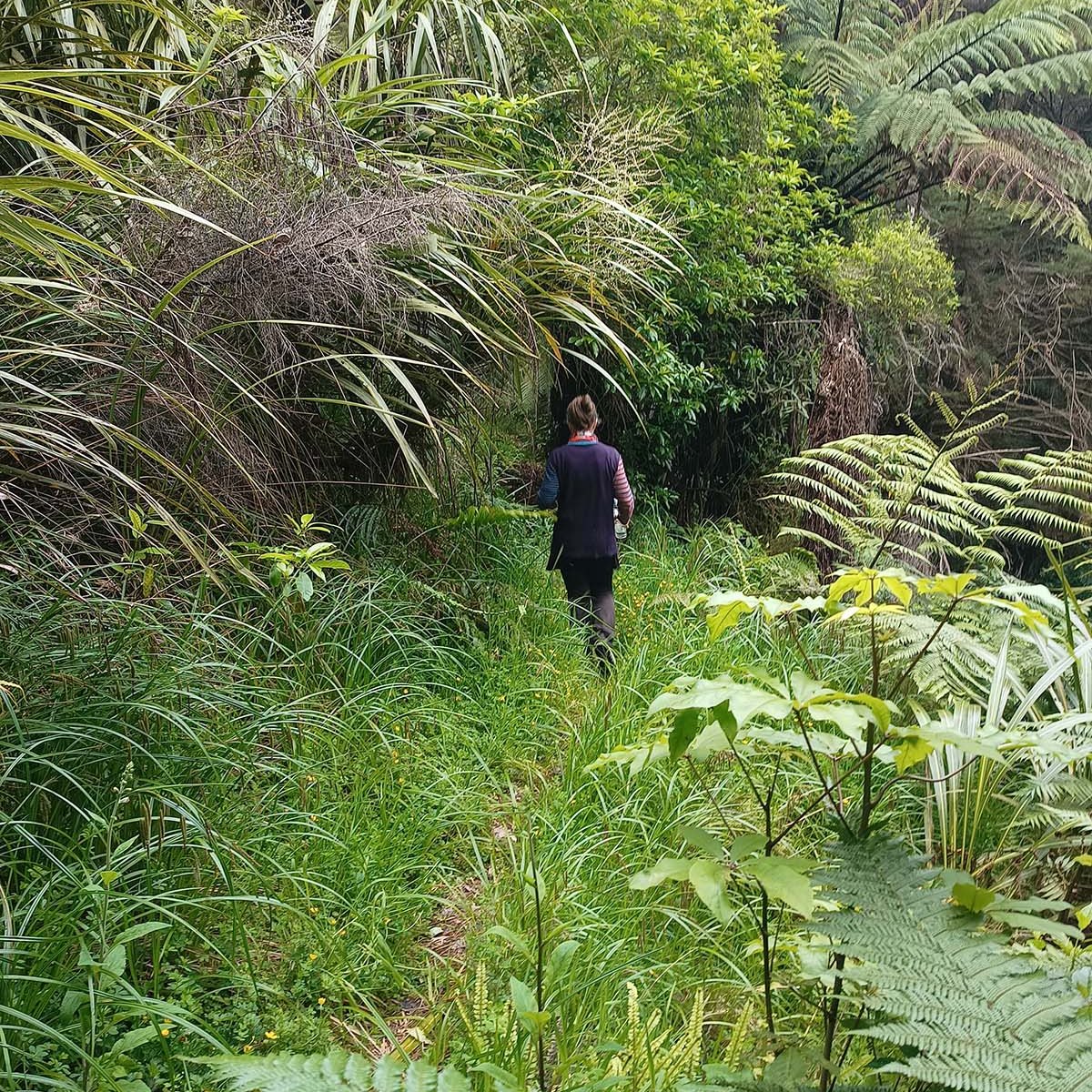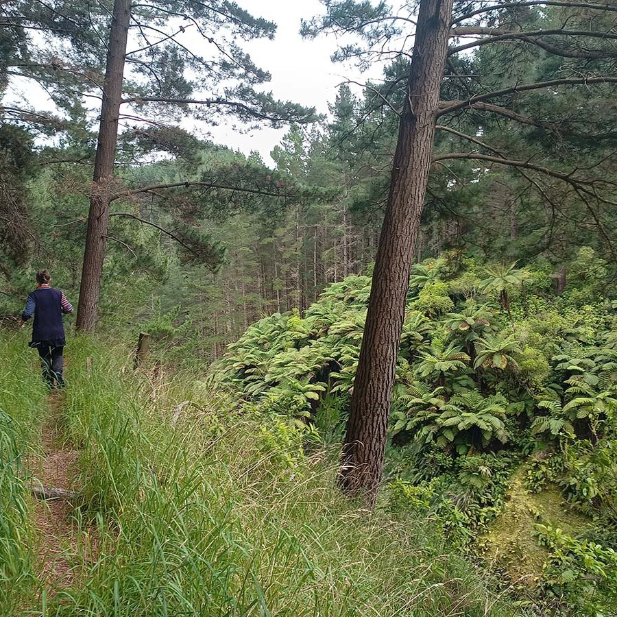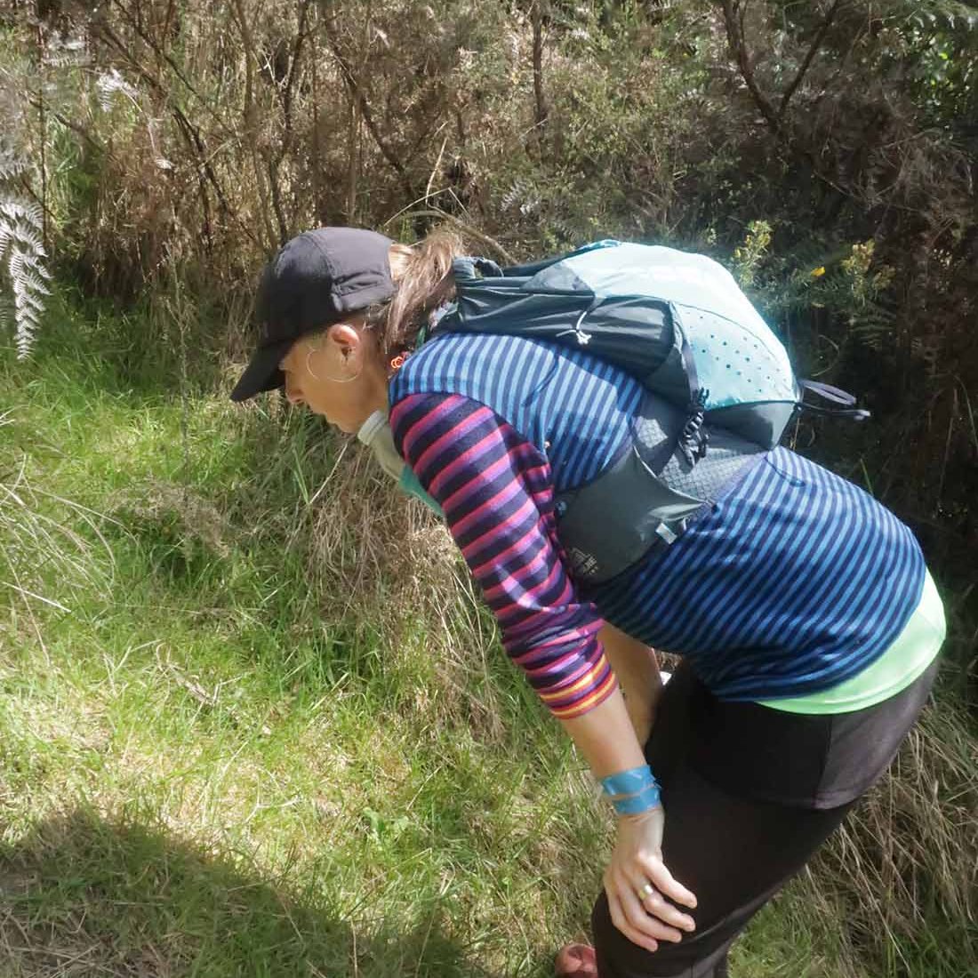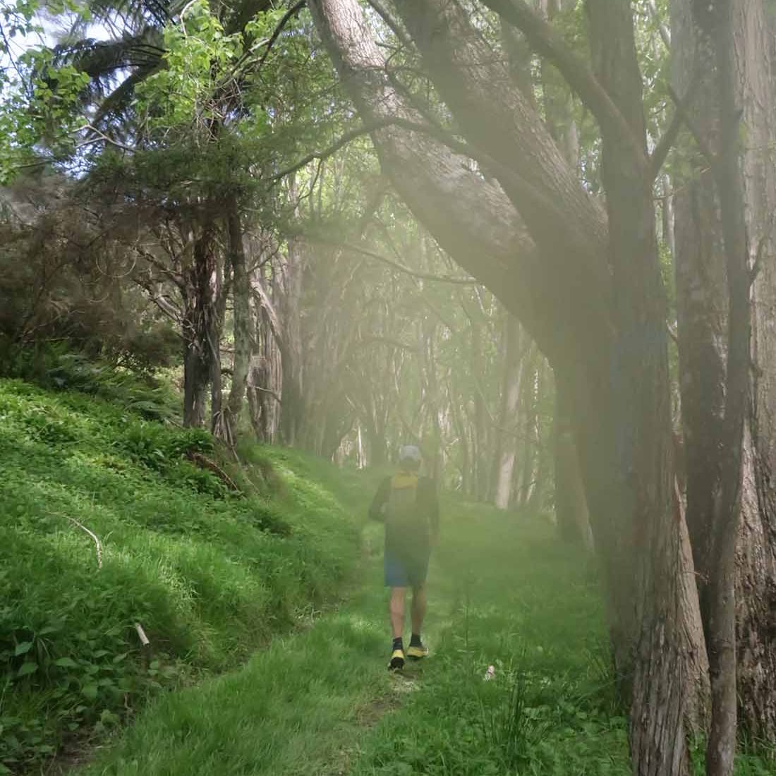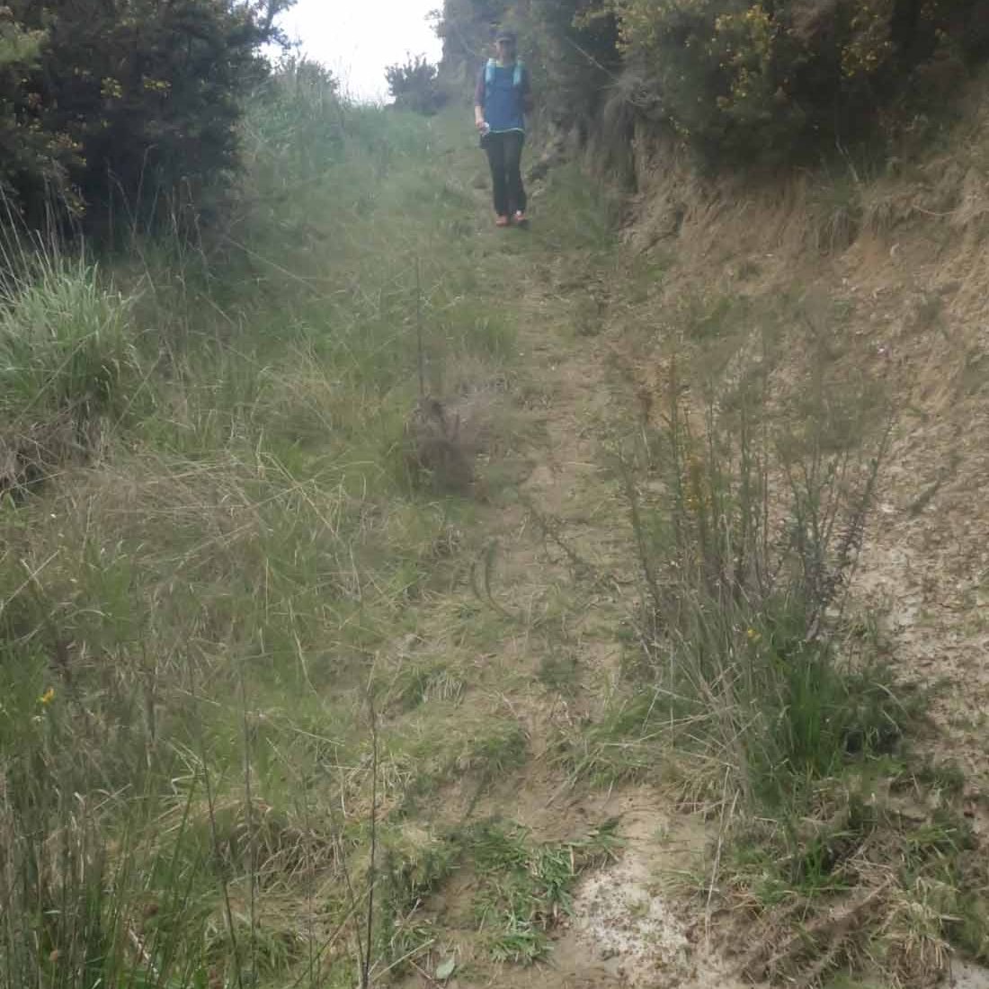 On a gradual downhill of about 5km, we constantly crossed a little stream on the farm. If one was very careful, you could keep your feet dry, and although I did manage that for the most part, I did end up dragging one foot through the water while trying to jump across. Later on I also stepped into mud. After what felt like a million stream crossings, we reached farm buildings (did I spot some ongaonga right next to it?), followed by grassy paddocks. After a gravel road crossing with some festive volunteers, and another climb, we were on our way to the beach.