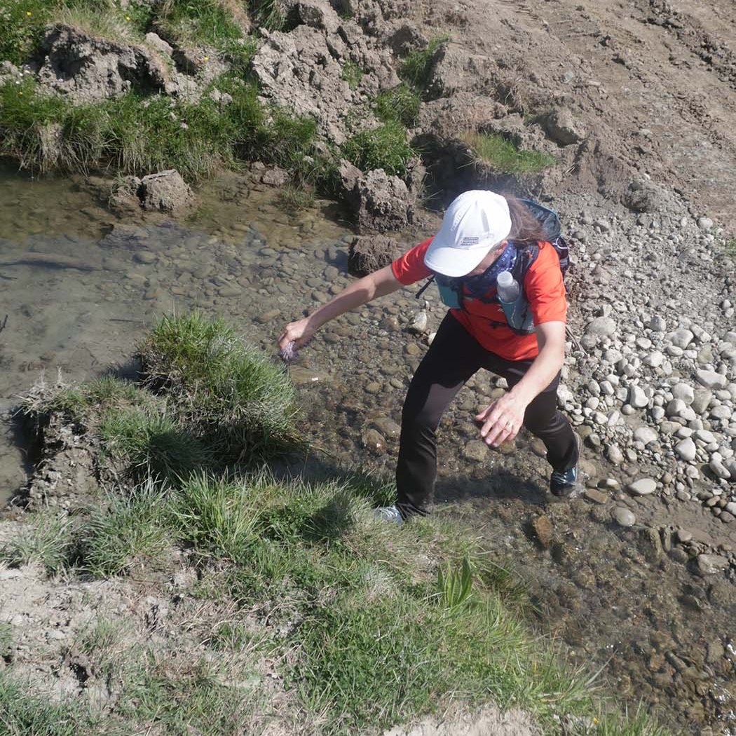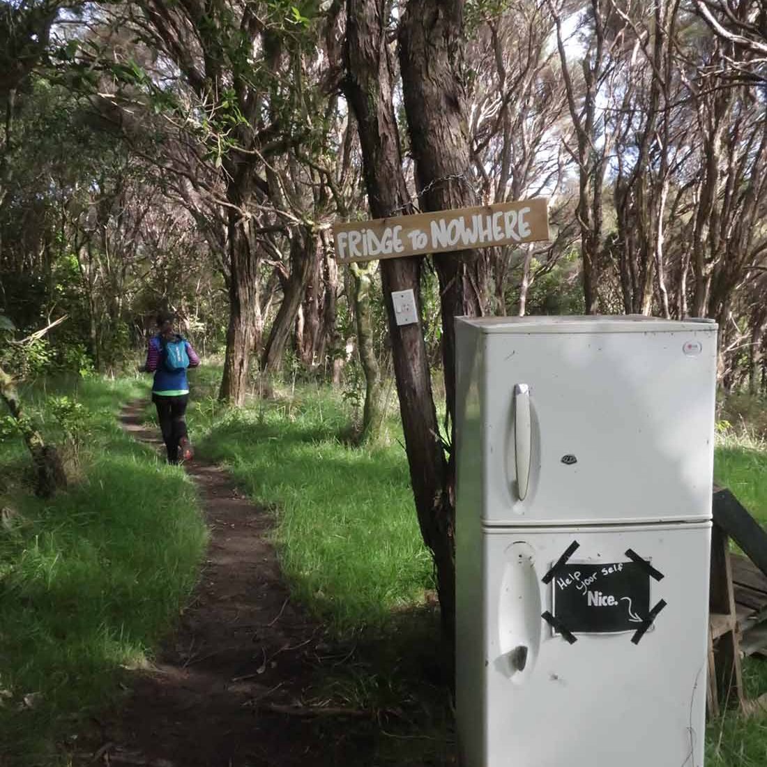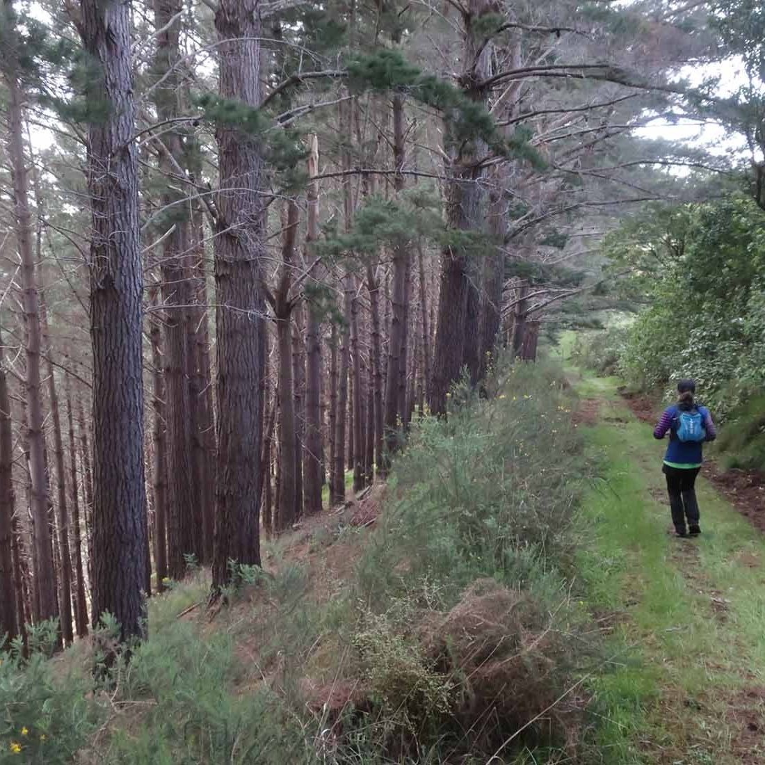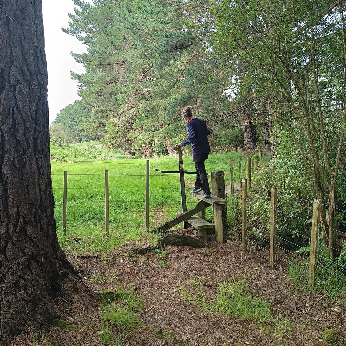 On a gradual downhill of about 5km, we constantly crossed a little stream on the farm. If one was very careful, you could keep your feet dry, and although I did manage that for the most part, I did end up dragging one foot through the water while trying to jump across. Later on I also stepped into mud. After what felt like a million stream crossings, we reached farm buildings (did I spot some ongaonga right next to it?), followed by grassy paddocks. After a gravel road crossing with some festive volunteers, and another climb, we were on our way to the beach.