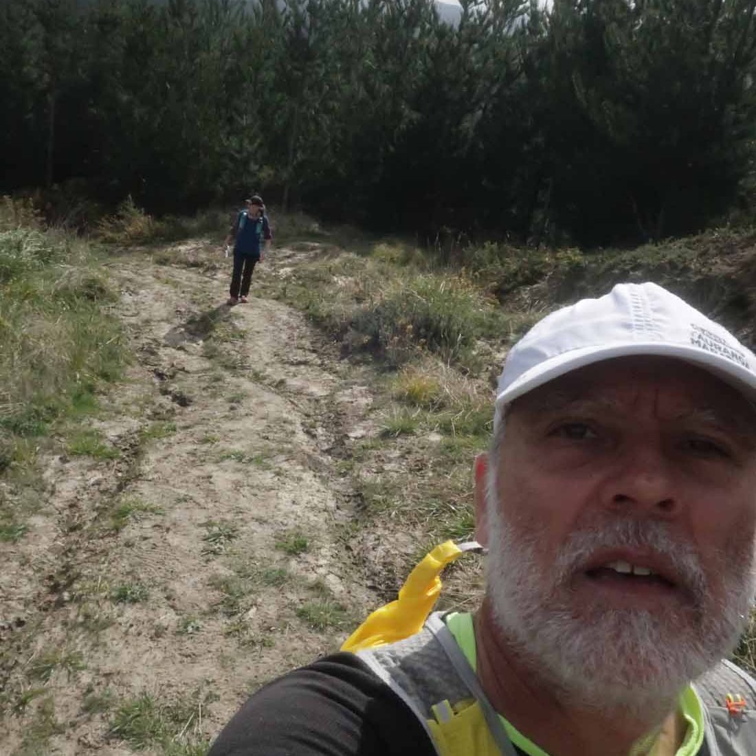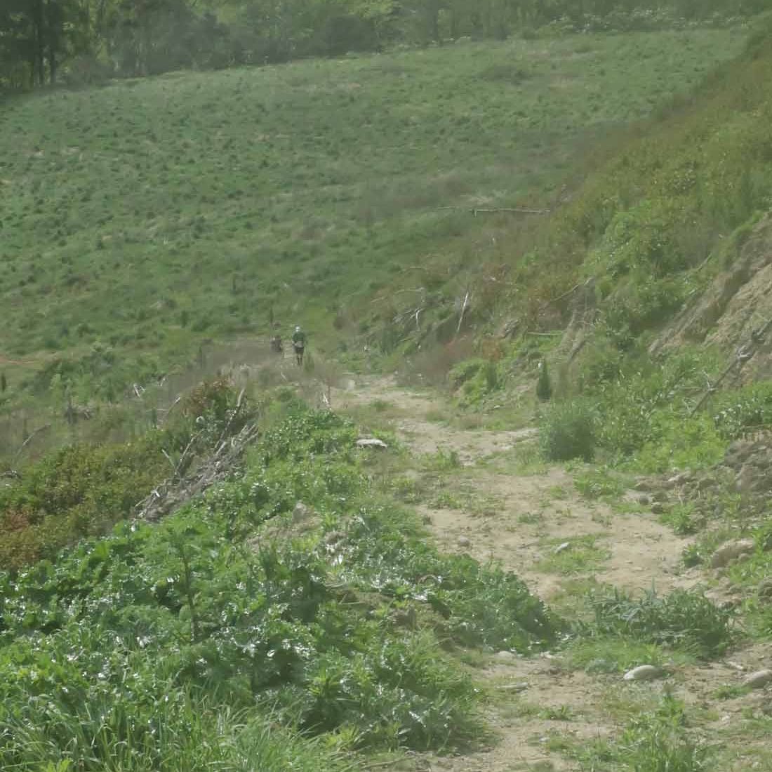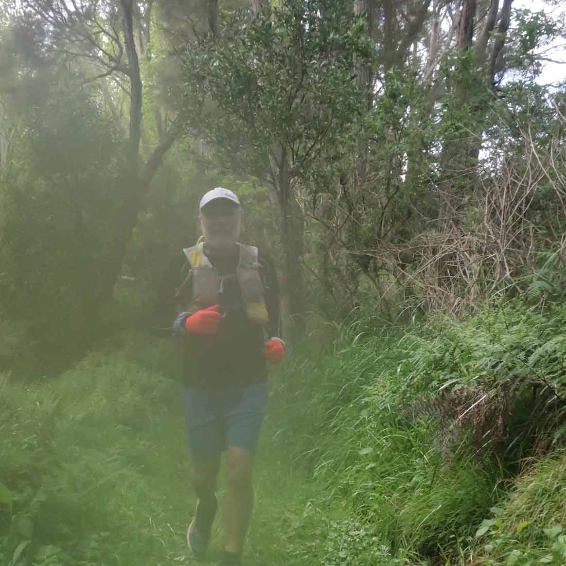After some running on undulating gravel roads, we started heading down the mountain on a grassy single track. Being wet made it slippery and no sooner did ‘slipping’ cross my mind, when Gerry landed on his arse. Luckily no damage done, and we could carry on down the steep downhill. These were also too steep to run. Whether going up or down, the incline was challenging to run on. At least for me, in my current state. Others were of course flying down the mountain.