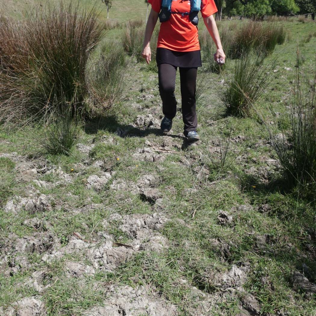 Have I mentioned before how much I dislike paddock running? I had ‘coastal trail’ in mind, and thought that perhaps it would just be the first few kilometres that are on the farm before heading into a trail. Where did I get this notion from? This was not the case. The whole run was through paddocks, on quad-bike paths and the occasional farm road. The terrain underfoot was brutal. Cattle tend to make really big/deep holes in mud, and these have dried out already, after some sunny and warm days. Had it been muddy, it would have been a challenge of a different kind, but it would not have been as demanding on feet, I think. Running on hard-packed hoofmarks is tricky. It wasn’t long before I developed some hotspots, again. What is up with that?