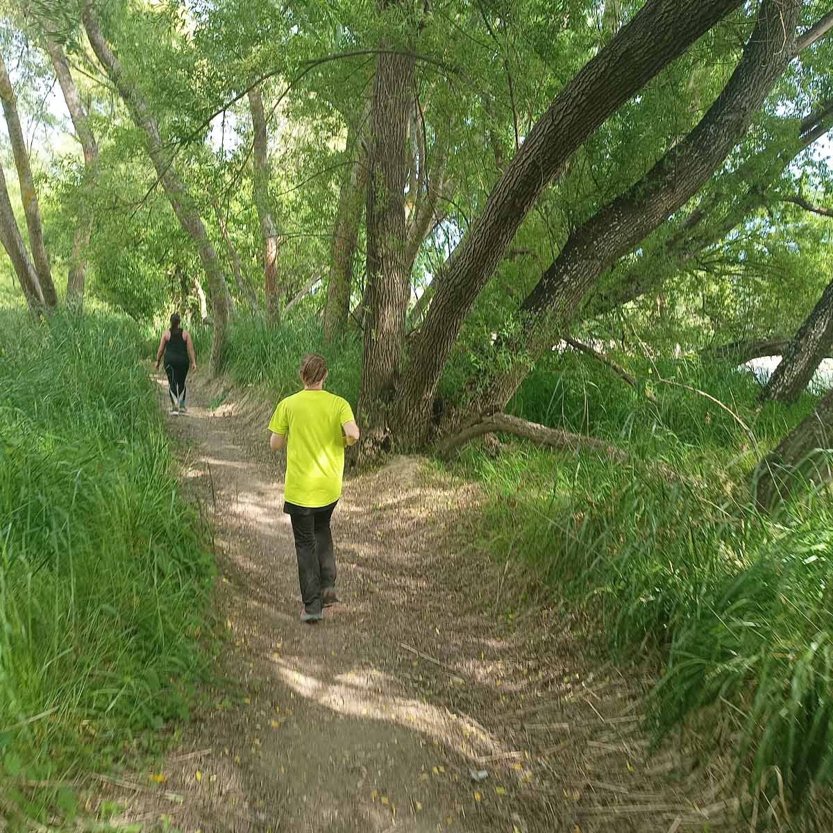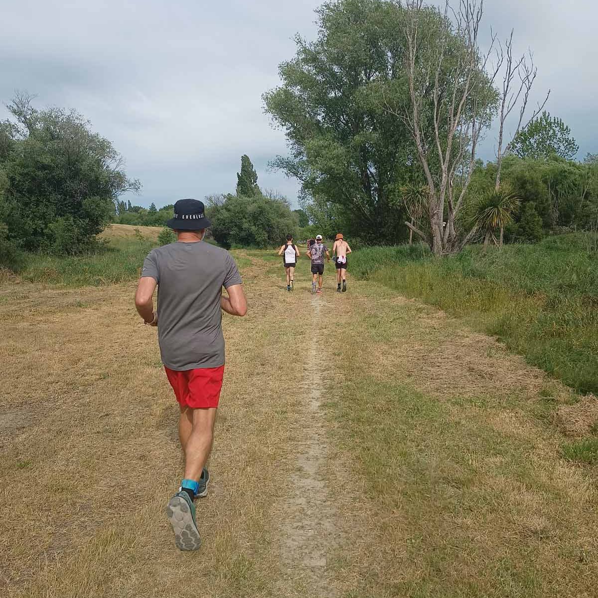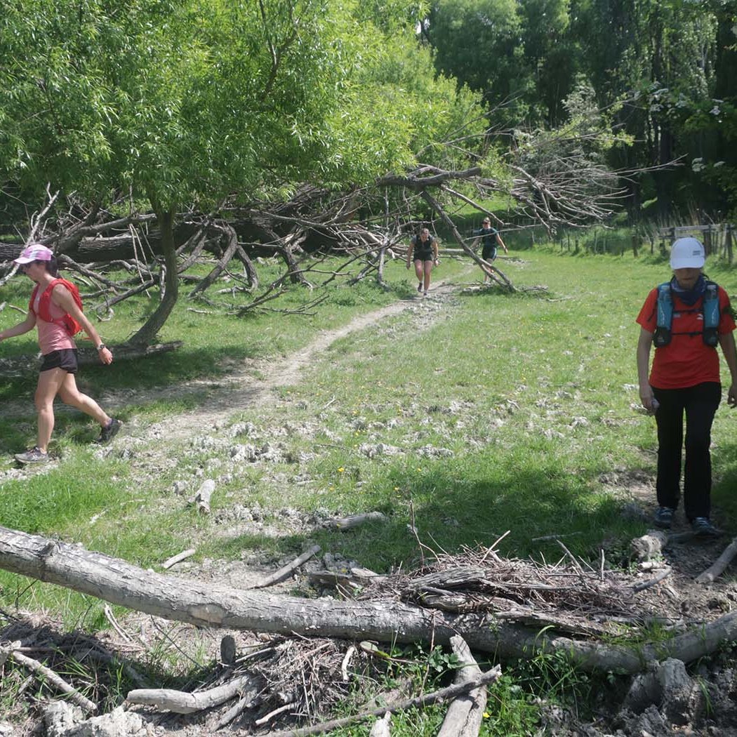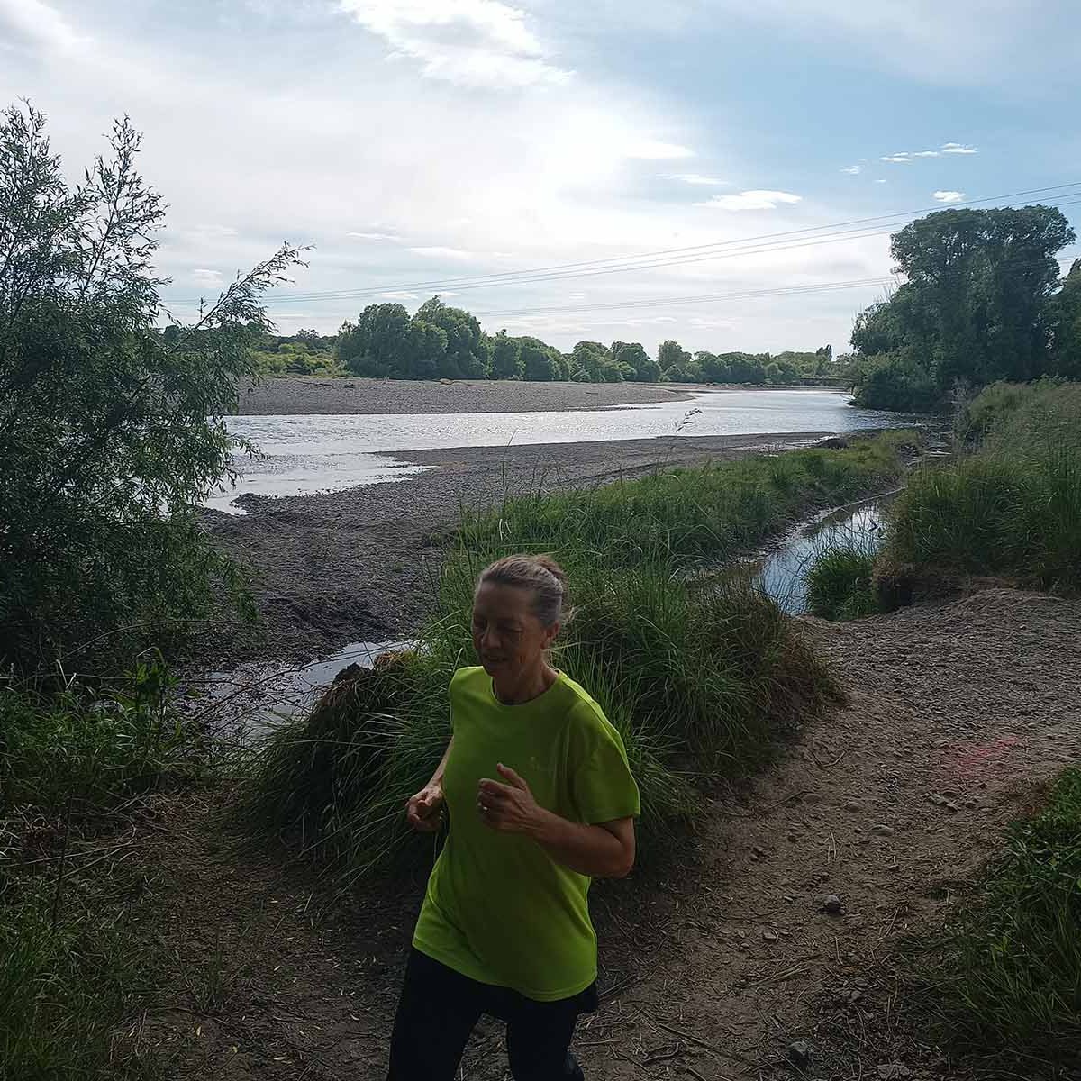 The terrain was not too bad. After the start, you make your way through a parking area and up the stop bank. Turning right we followed the stop bank, which is easy underfoot, for a bit more than a kilometre, before a steep drop down the bank led us to a grassy area next to the Tukituki River, to take us back the way we came. This was uneven and just a wee bit like running in paddocks, although this wasn’t nearly as bad. This stretch is about 1.5km before passing near the start/finish which was just on the other side of the stop bank. Being so close to the base means that supporters can walk over the stop bank and cheer on the runners. A couple of hundred metres further we went under the main road bridge (at the 3km mark), up and down the stop bank where we reached curvy bike trails that run next to the river. It is sheltered from the sun and under the trees, following the river on the northern side of the main road bridge until the turn-around point (after about 1.8km) to head back to base. Again we made our way up the stop bank to run along the easy path on top back to finish the first loop.