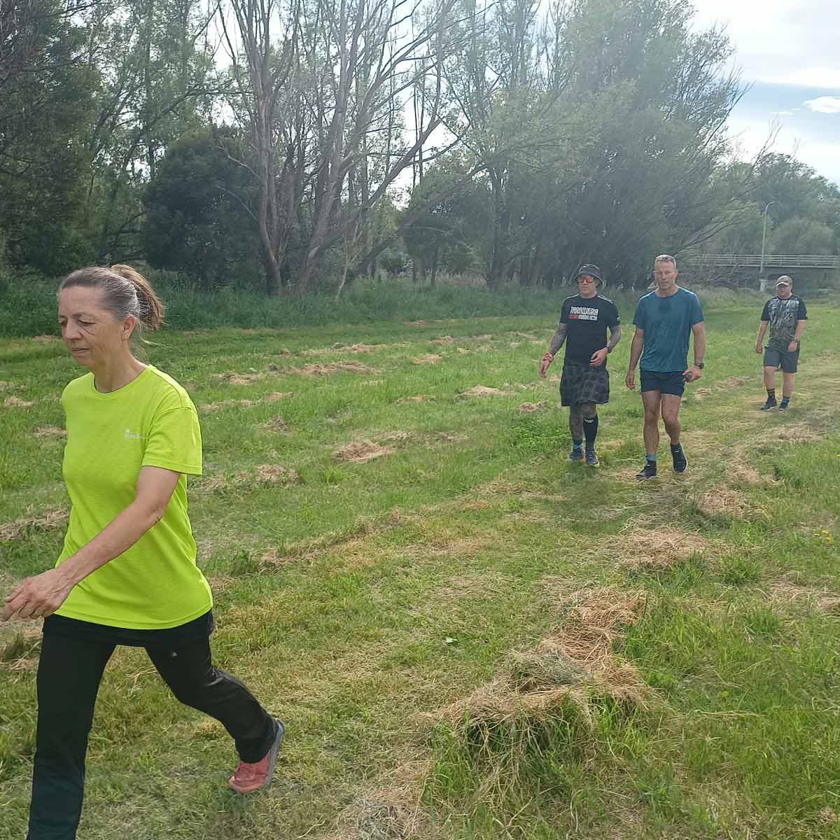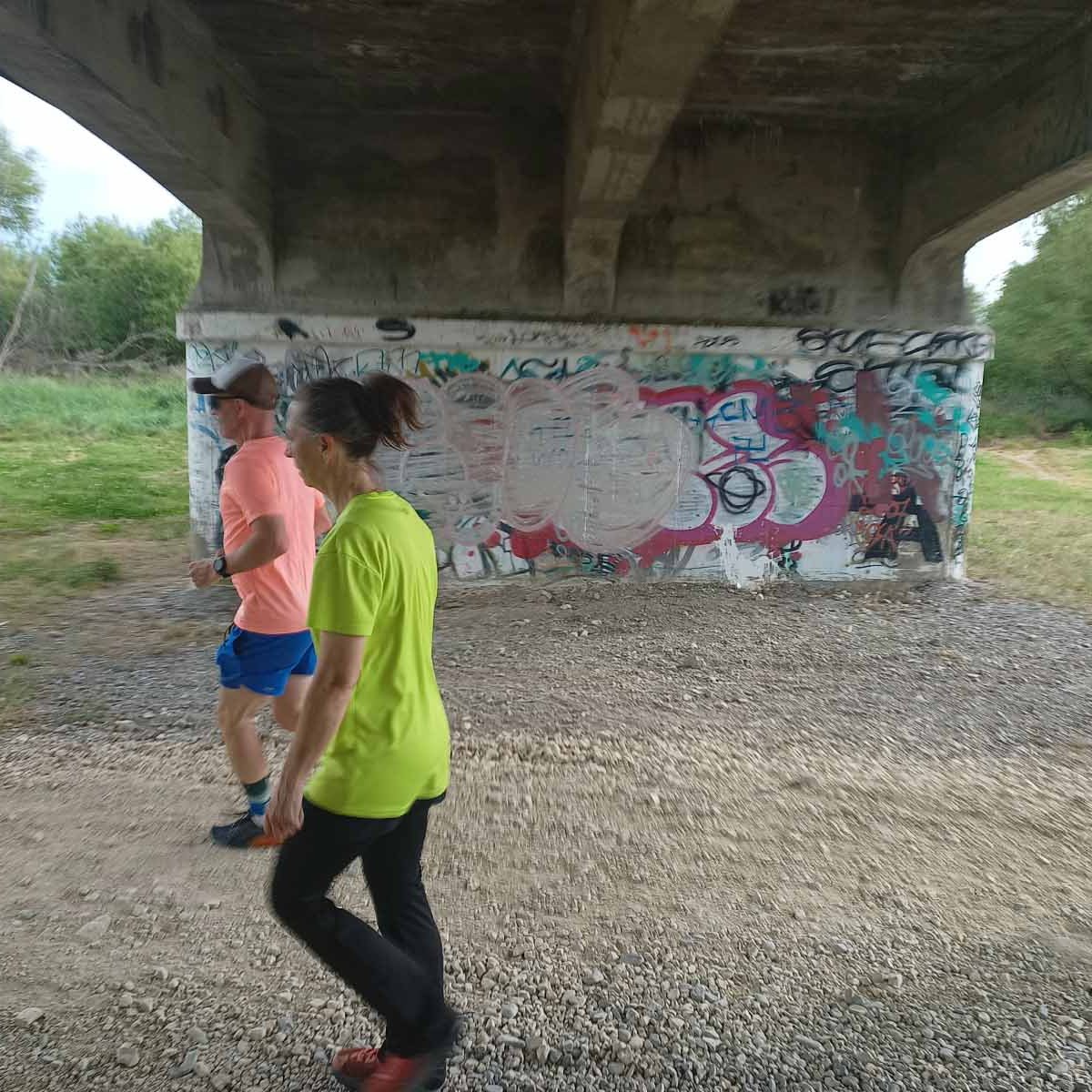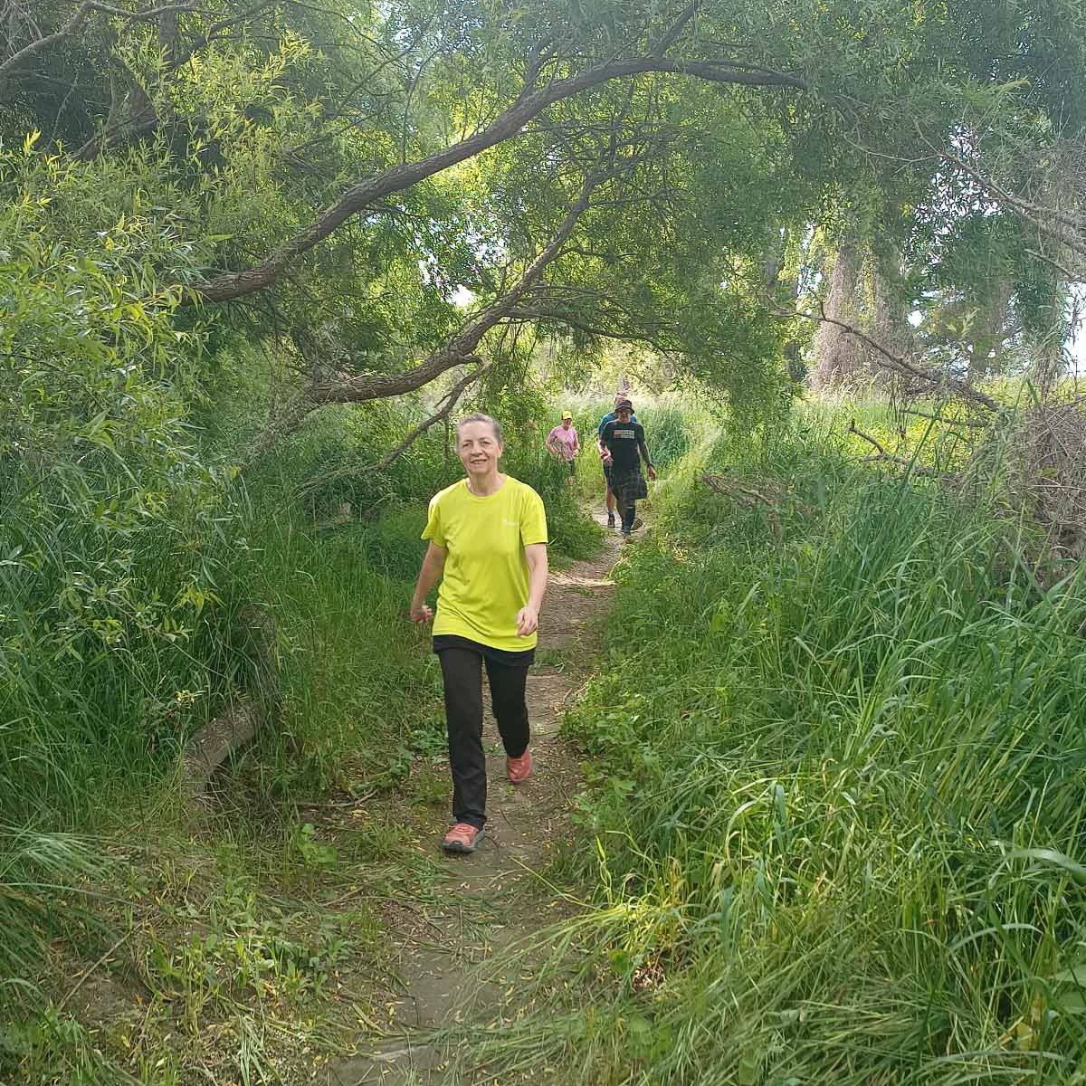 The terrain was not too bad. After the start, you make your way through a parking area and up the stop bank. Turning right we followed the stop bank, which is easy underfoot, for a bit more than a kilometre, before a steep drop down the bank led us to a grassy area next to the Tukituki River, to take us back the way we came. This was uneven and just a wee bit like running in paddocks, although this wasn’t nearly as bad. This stretch is about 1.5km before passing near the start/finish which was just on the other side of the stop bank. Being so close to the base means that supporters can walk over the stop bank and cheer on the runners. A couple of hundred metres further we went under the main road bridge (at the 3km mark), up and down the stop bank where we reached curvy bike trails that run next to the river. It is sheltered from the sun and under the trees, following the river on the northern side of the main road bridge until the turn-around point (after about 1.8km) to head back to base. Again we made our way up the stop bank to run along the easy path on top back to finish the first loop.