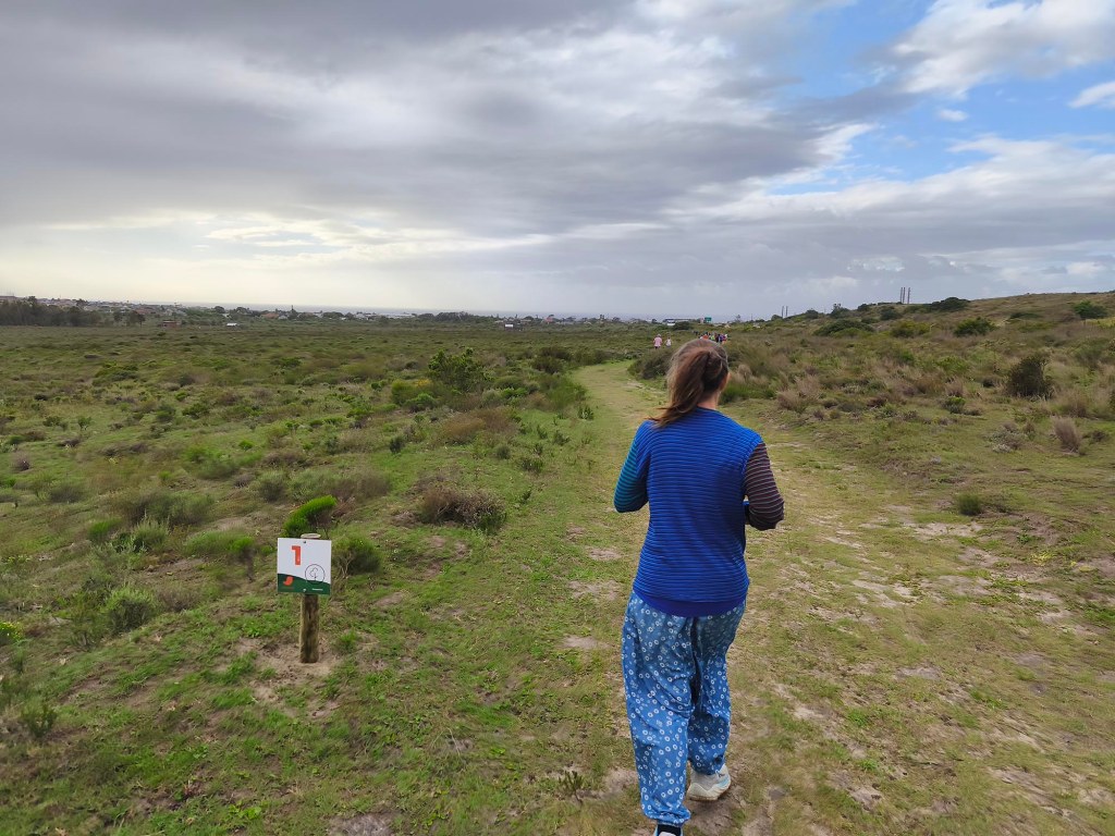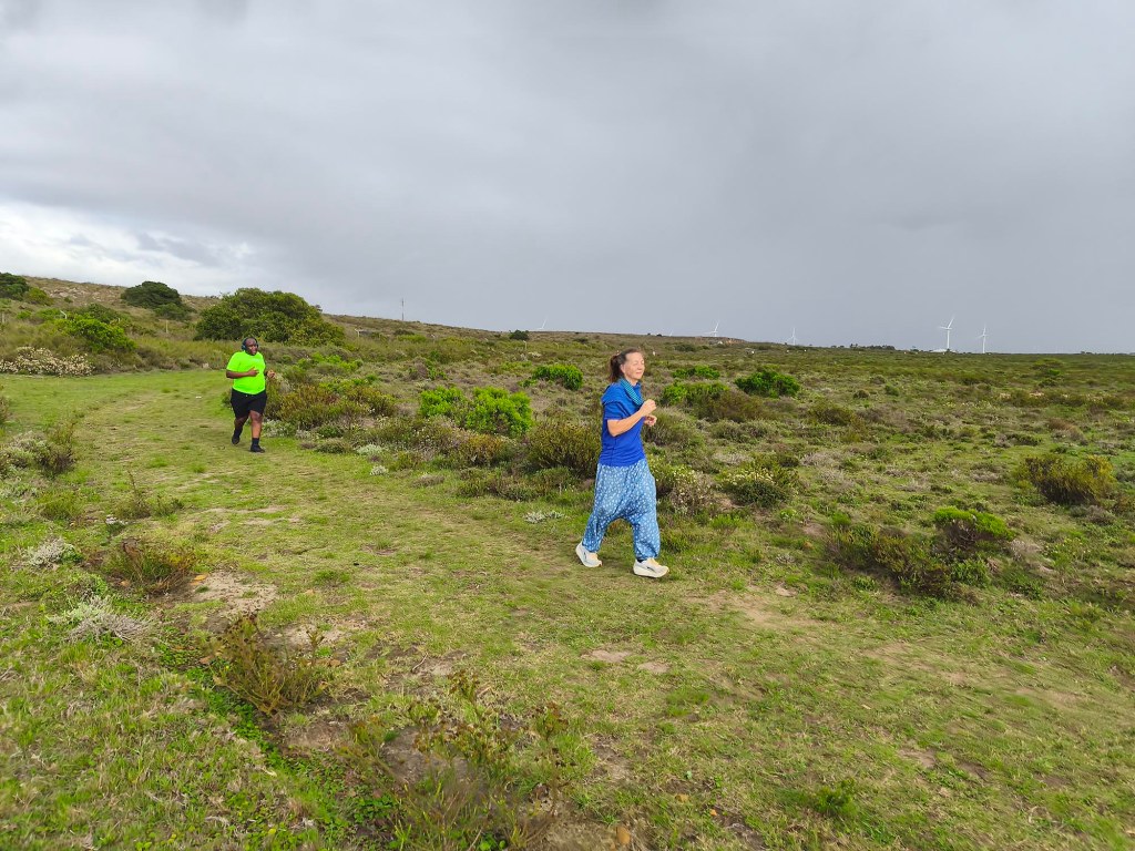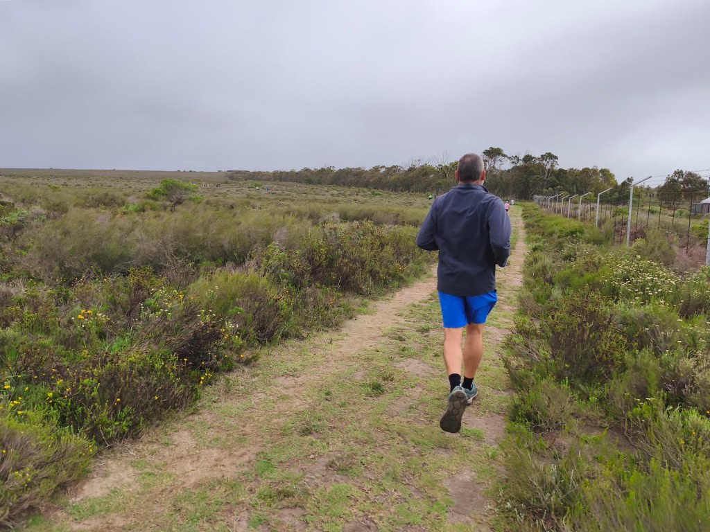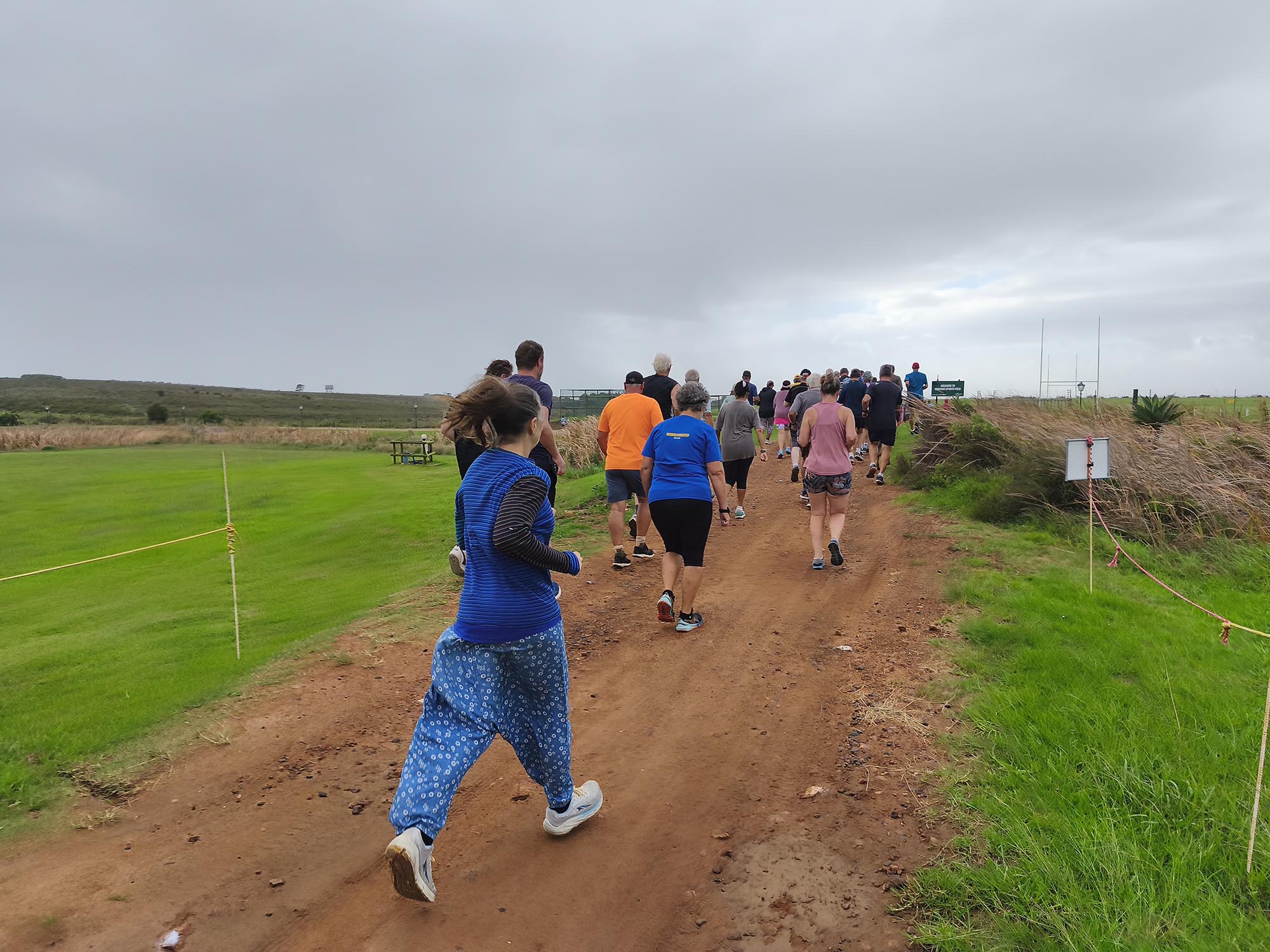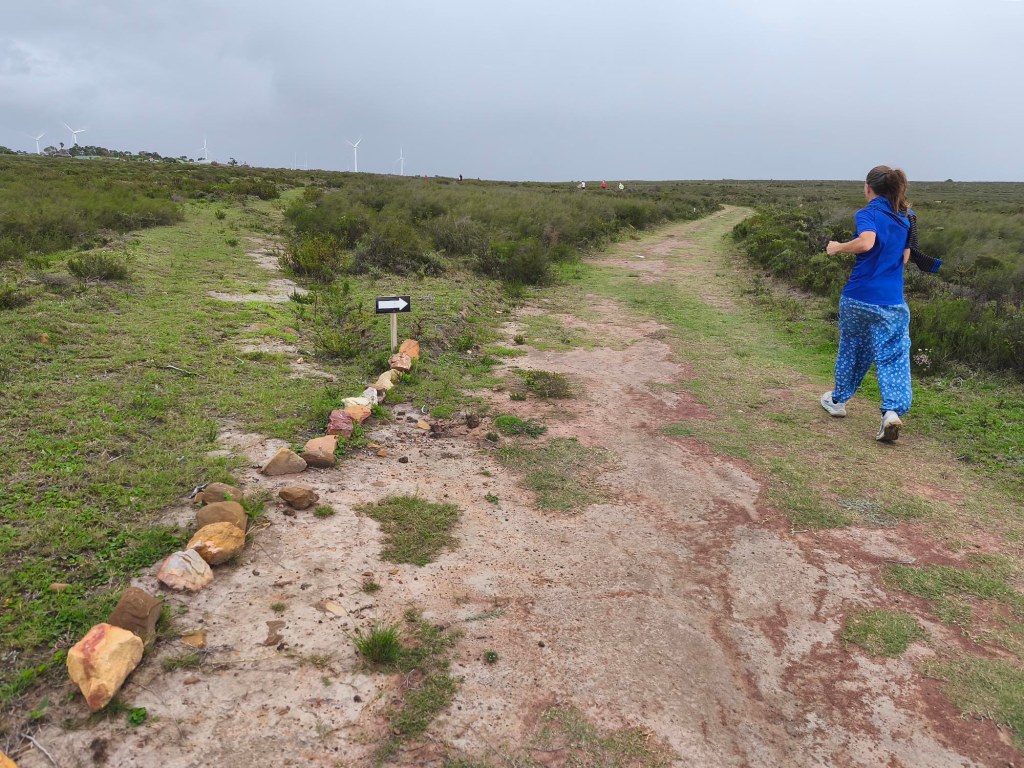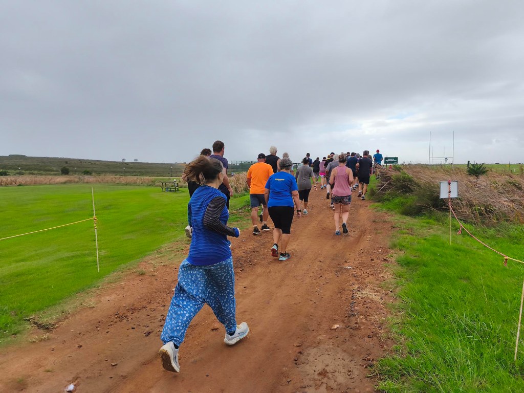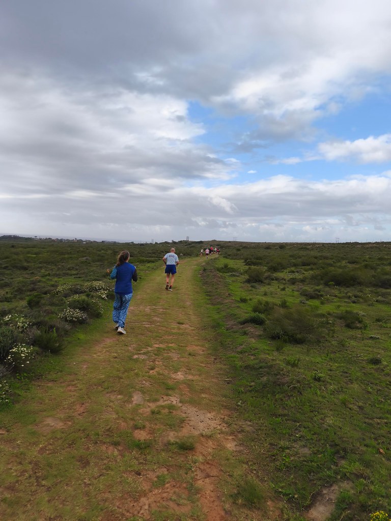 We arrived shortly before the start, and standing in the cold wind and spits of rain, I was contemplating our ‘bad’ luck with the weather. Apart from running shoes I didn’t really have appropriate clothes to wear for a run, so donned the nearest thing that is not a pair of jeans. Since the weather wasn’t ideal and looked even worse on the horizon, we decided to start with a jog in the hope of warming up a bit, and getting it done quicker. My baggy hippie-type pants turned into a sail catching a lot of wind. In the right direction, it could have counted in my favour, but it felt like nothing other than a handicap.