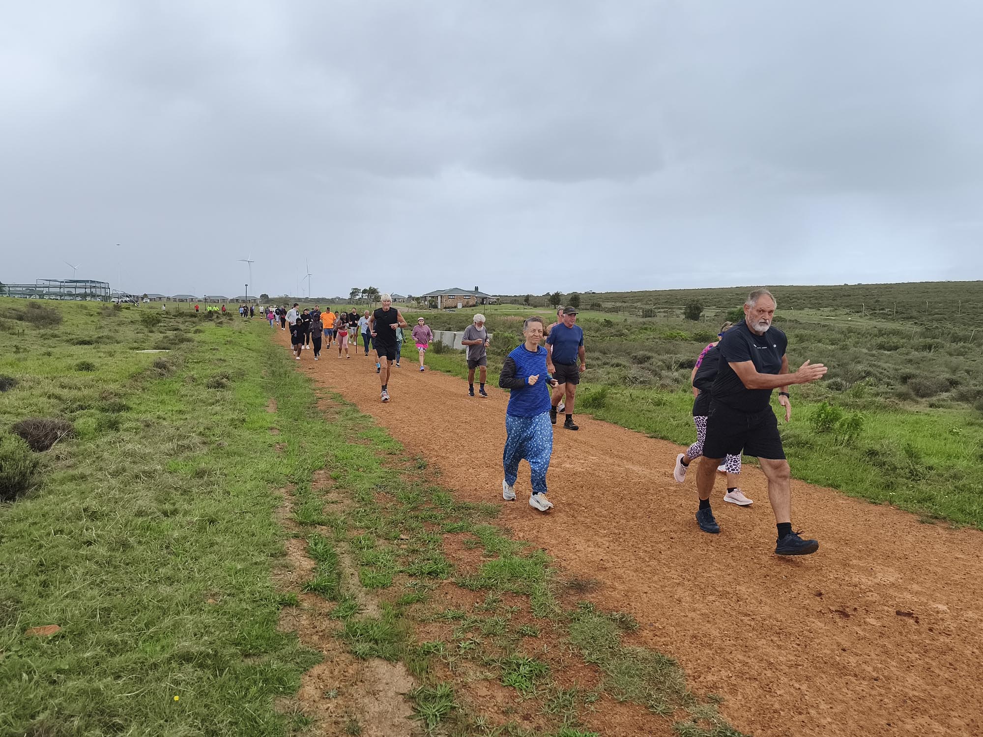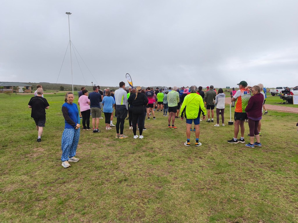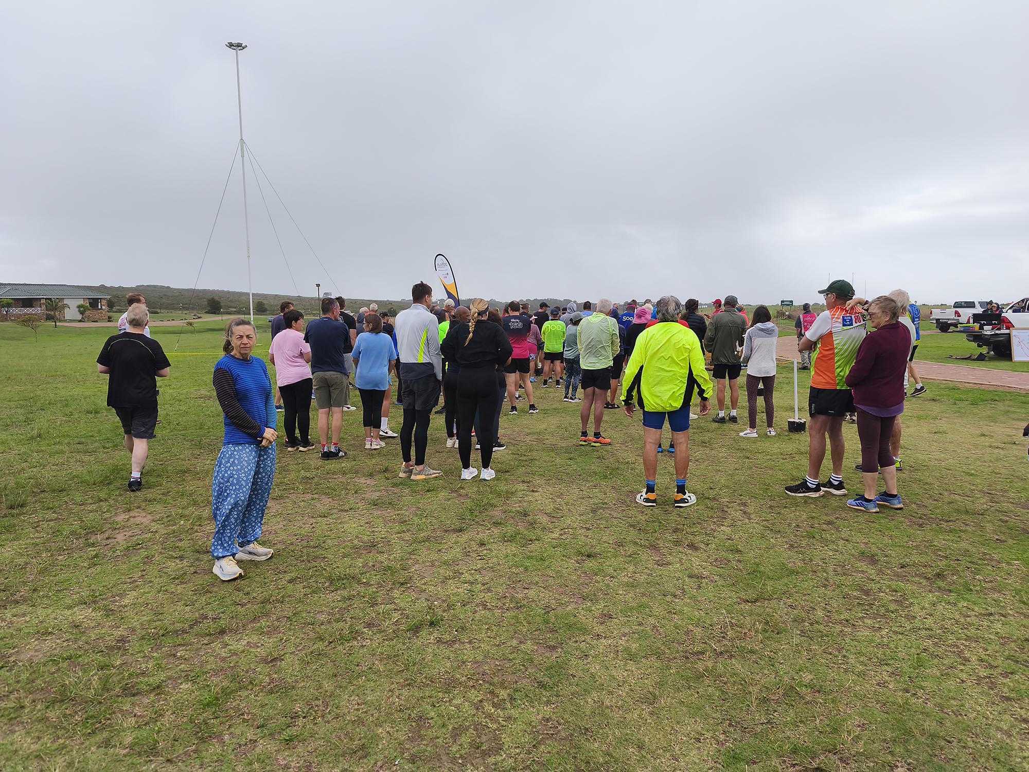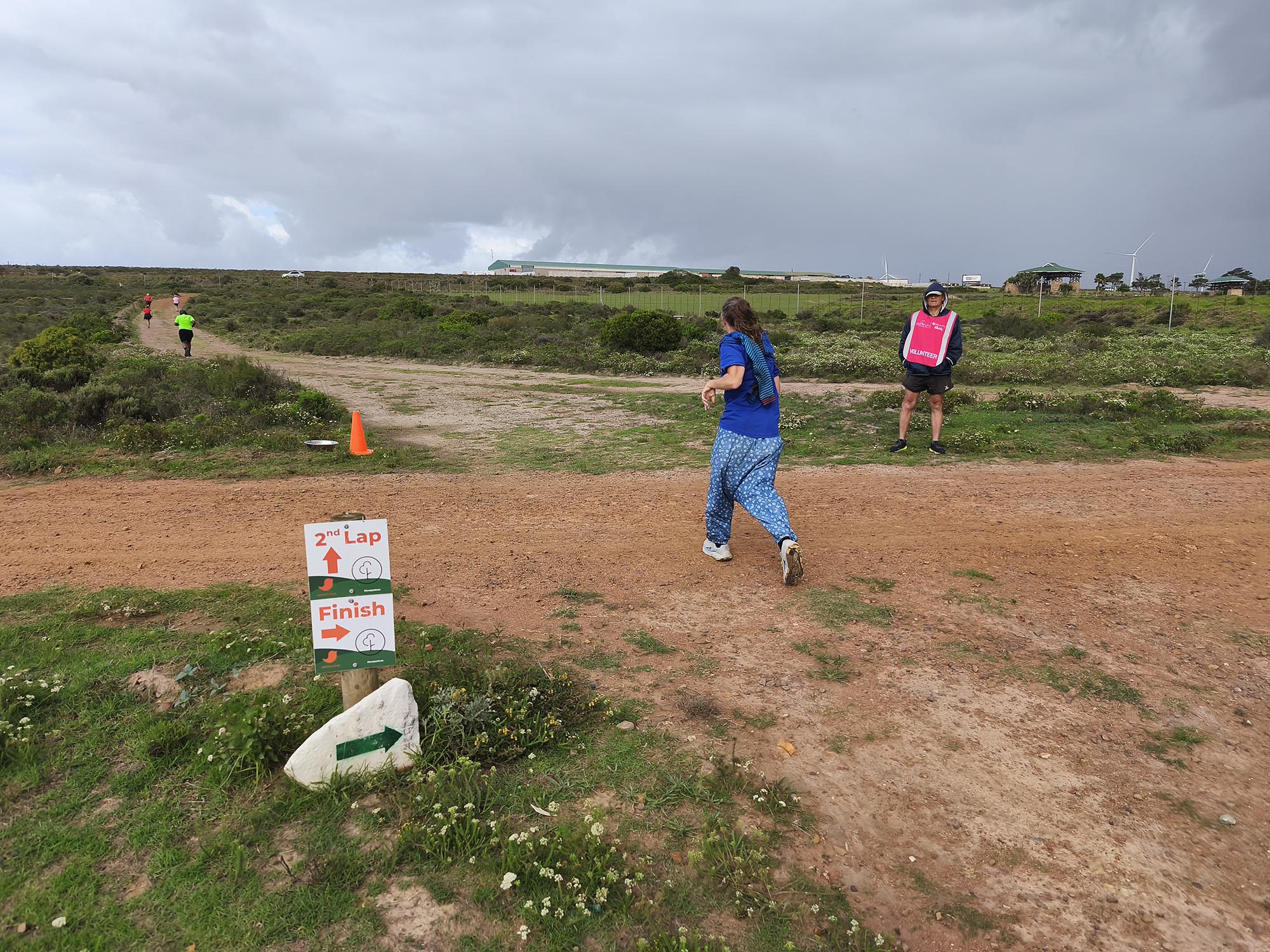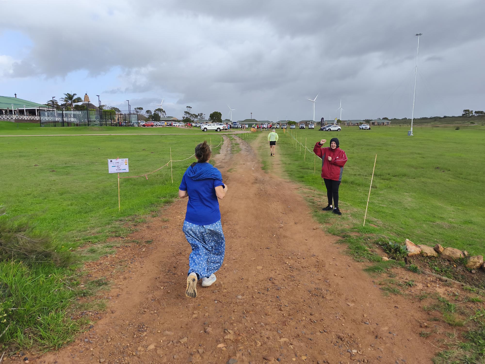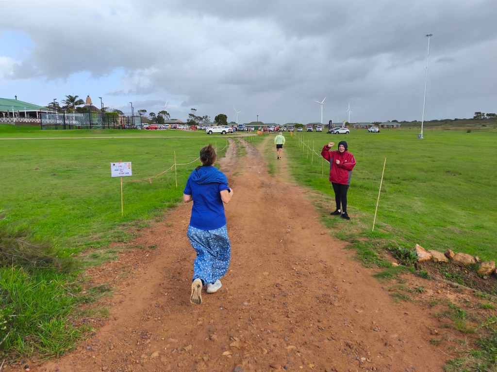 We arrived shortly before the start, and standing in the cold wind and spits of rain, I was contemplating our ‘bad’ luck with the weather. Apart from running shoes I didn’t really have appropriate clothes to wear for a run, so donned the nearest thing that is not a pair of jeans. Since the weather wasn’t ideal and looked even worse on the horizon, we decided to start with a jog in the hope of warming up a bit, and getting it done quicker. My baggy hippie-type pants turned into a sail catching a lot of wind. In the right direction, it could have counted in my favour, but it felt like nothing other than a handicap.