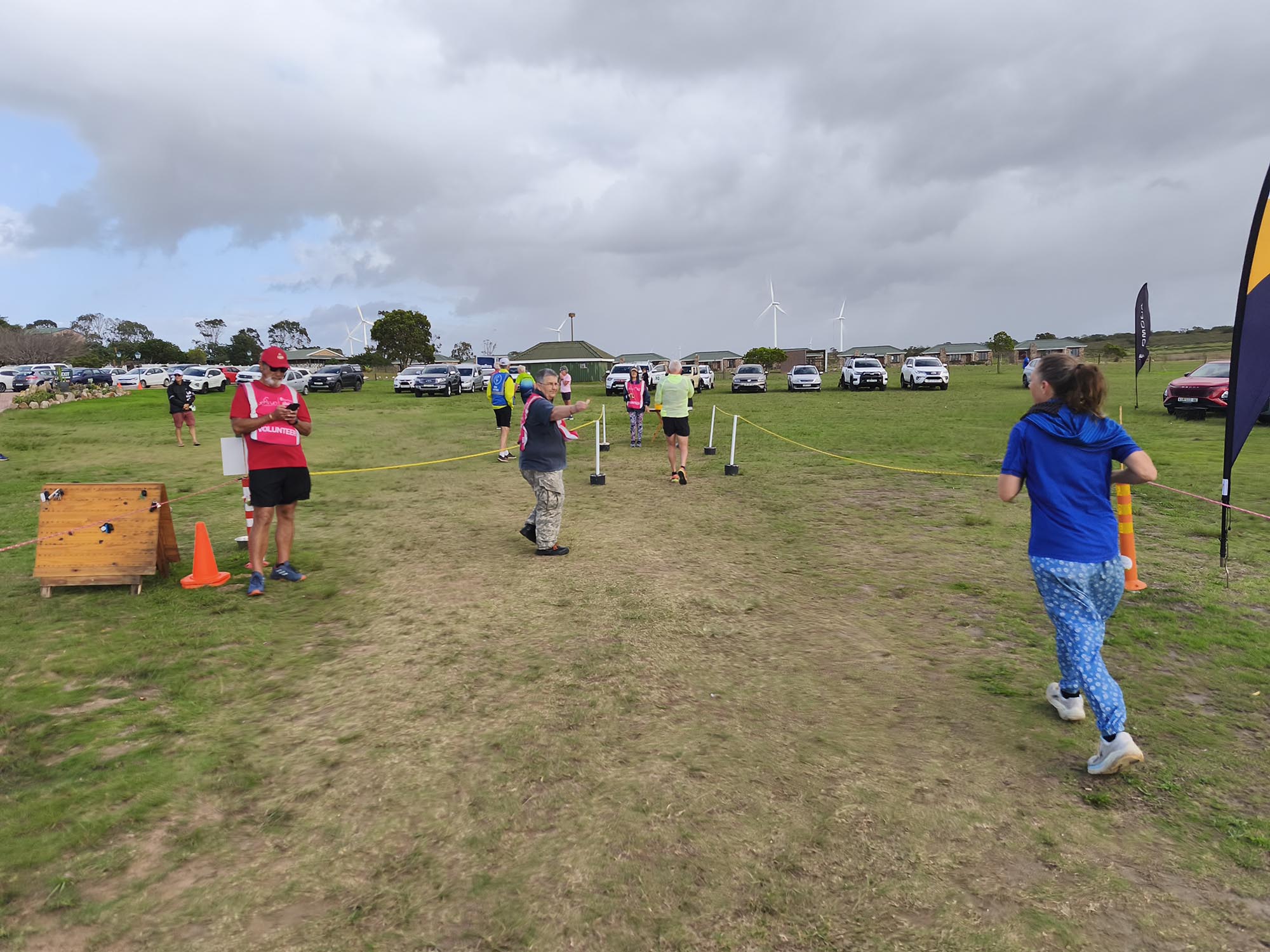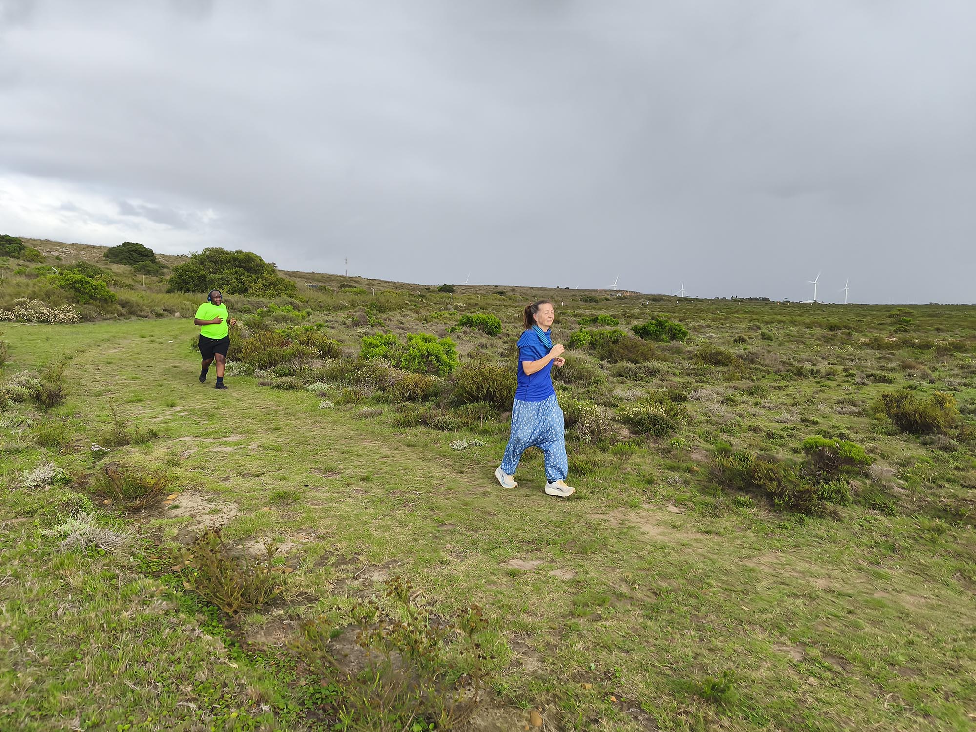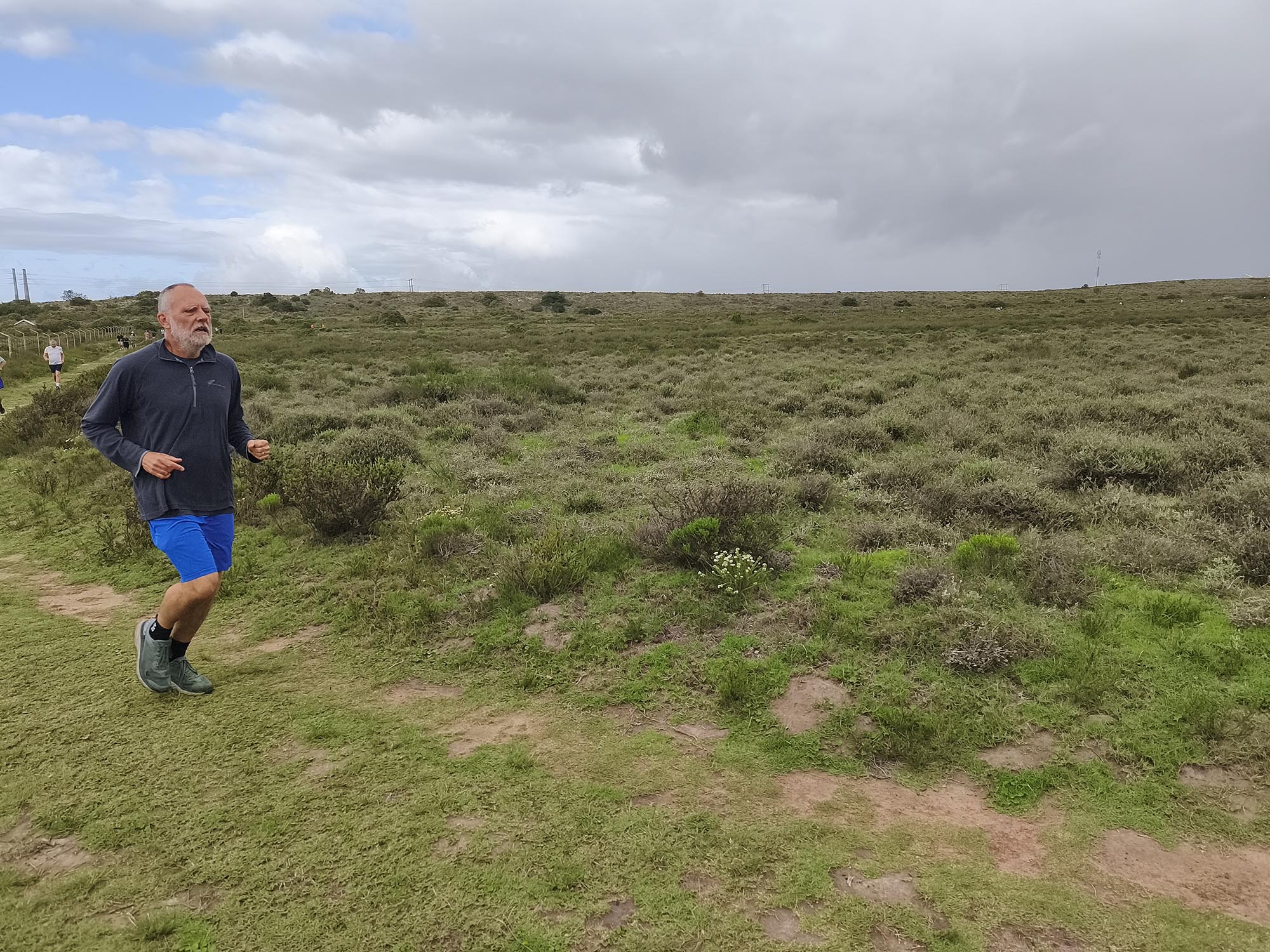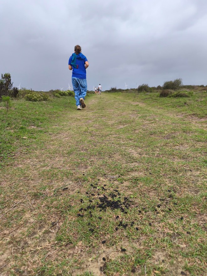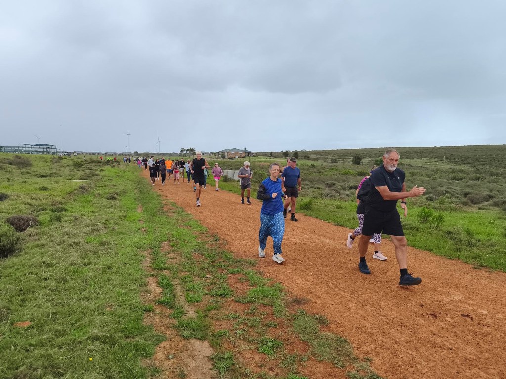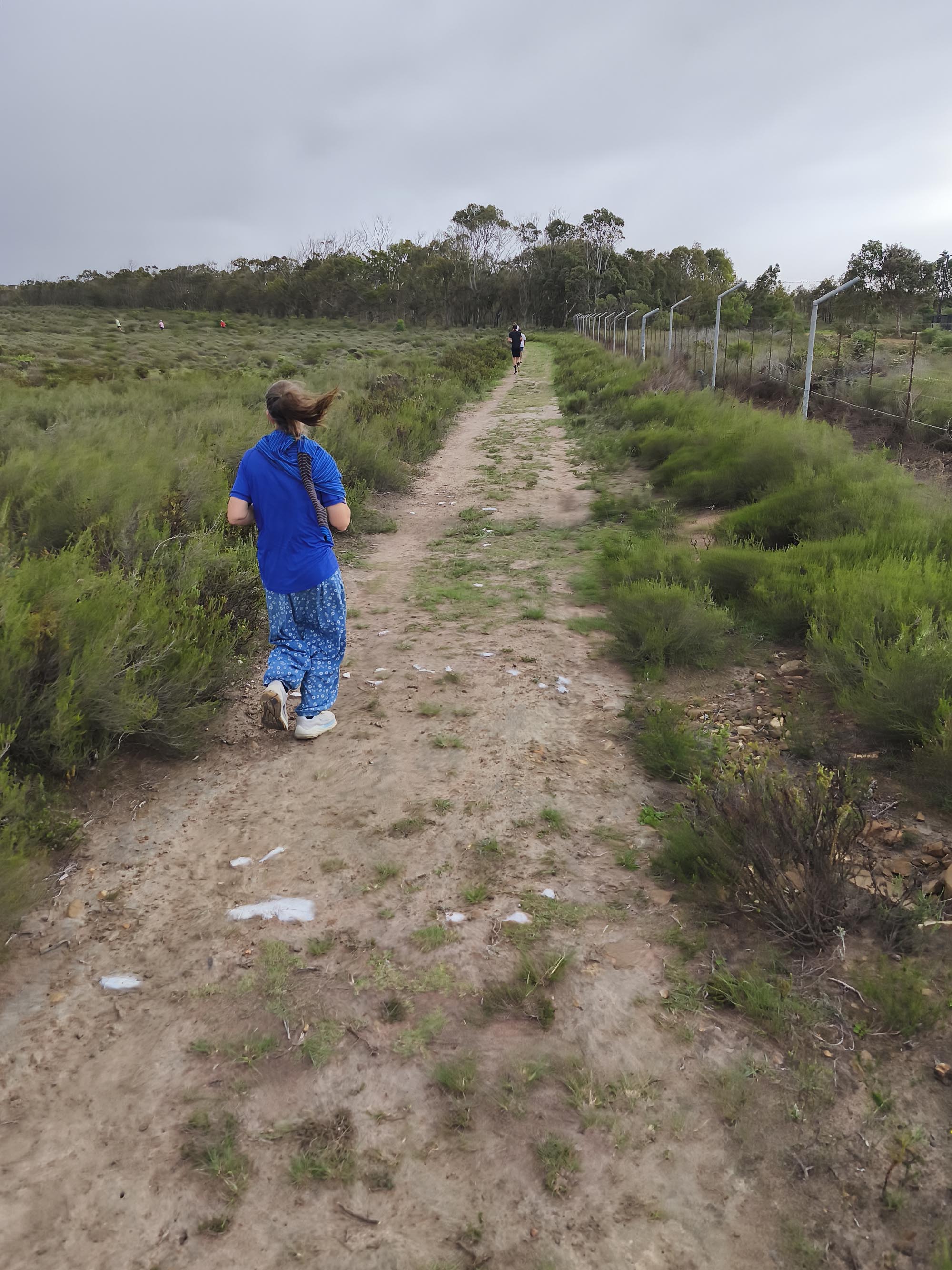 We arrived shortly before the start, and standing in the cold wind and spits of rain, I was contemplating our ‘bad’ luck with the weather. Apart from running shoes I didn’t really have appropriate clothes to wear for a run, so donned the nearest thing that is not a pair of jeans. Since the weather wasn’t ideal and looked even worse on the horizon, we decided to start with a jog in the hope of warming up a bit, and getting it done quicker. My baggy hippie-type pants turned into a sail catching a lot of wind. In the right direction, it could have counted in my favour, but it felt like nothing other than a handicap.