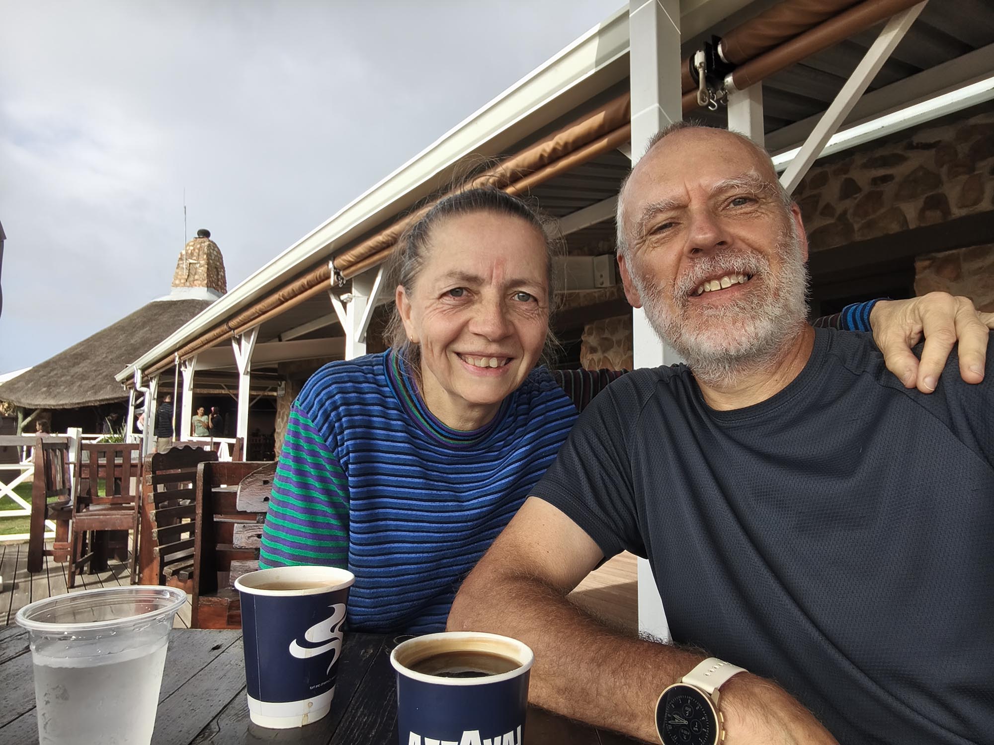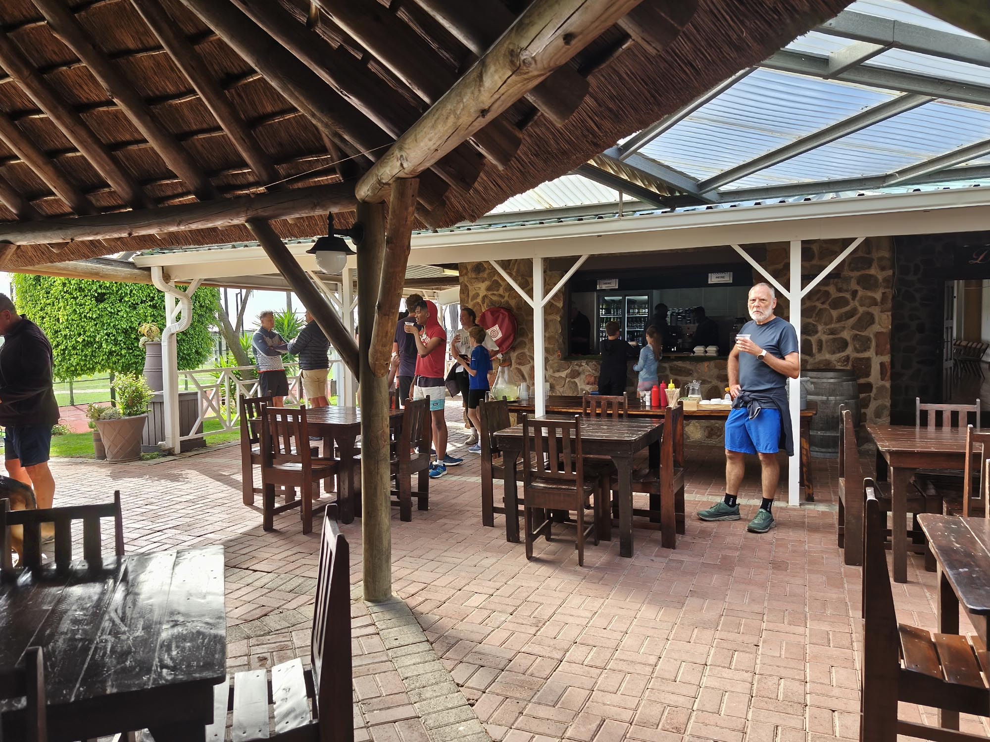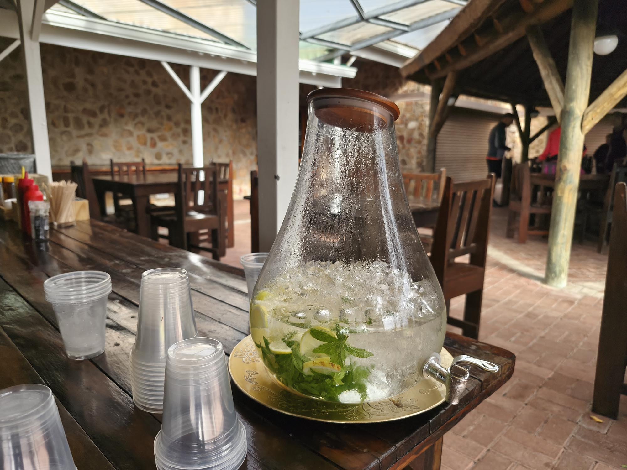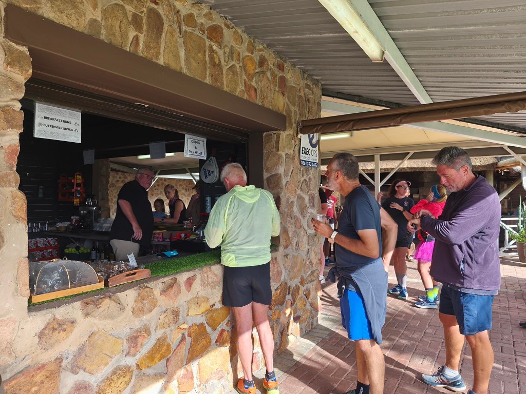 At the finish, coffee and snacks could be bought from the gorgeous stone and thatch roof venue. Water with lemon and mint were provided and the sheltered area meant a lot of participants were just relaxing and catching up. We bought a coffee and sat on the porch with a beautiful view over the farm thinking about life, death, running, and survival. A nagging concern that our upcoming flights might be cancelled (due to war and ultimately greed) and that we might not be able to get home, were thoughts I was trying to avoid.