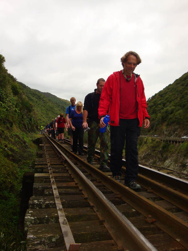 DSC02257 Published November 12, 2013 at 600 × 800 in Manawatu Gorge Track & Tunnel Walk (10 April 2011) ← Previous Next → Gerry concentrating hard on another train bridge without railings.