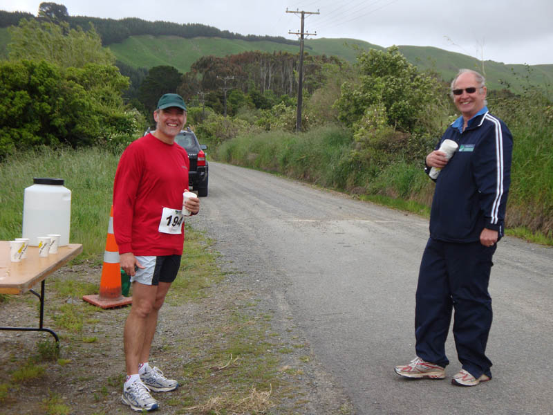 DSC03161 Published November 19, 2013 at 800 × 600 in Kahuterawa Two Day Classic – 19 & 20 November 2011 (43.99km) ← Previous Next → Gerry and Alister (who manned the water table) having a chat while we take a rest at the start of the Greens Road out-and-back section.