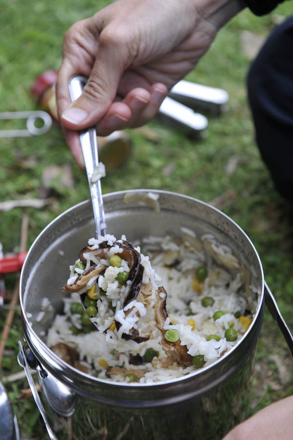 _DSC8378 Published December 10, 2013 at 600 × 900 in Queen Charlotte Track (2 – 5 December 2013) ← Previous Next → Oo-lala – a delicious mix of rice, Shiitake mushrooms and assorted veges.