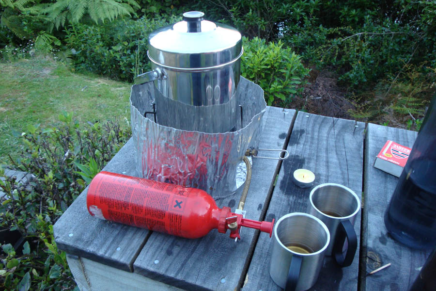 DSC04139 Published December 10, 2013 at 900 × 600 in Queen Charlotte Track (2 – 5 December 2013) ← Previous Next → A typical scene in our camp. Billy on the fire and a tipple in the cup.