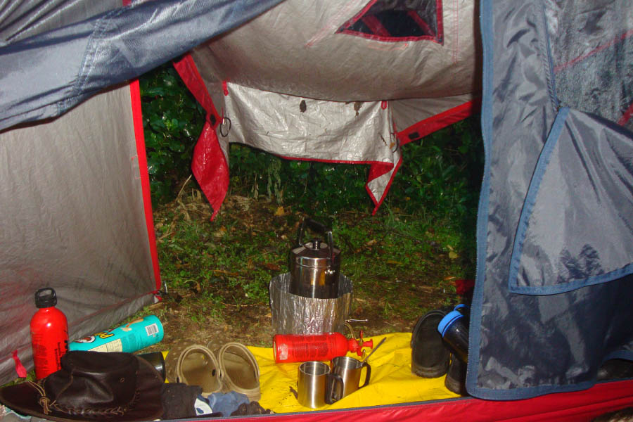 DSC04208 Published December 10, 2013 at 900 × 600 in Queen Charlotte Track (2 – 5 December 2013) ← Previous Next → A pot of morning coffee, with the tent flap providing some shelter from the rain.