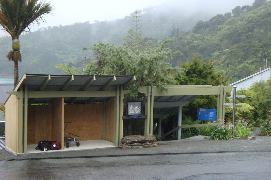DSC04213 Published December 10, 2013 at 900 × 600 in Queen Charlotte Track (2 – 5 December 2013) ← Previous Next → Our sorry looking bags at the Portage Resort Hotel, from where they were taken back to the finish in Picton.