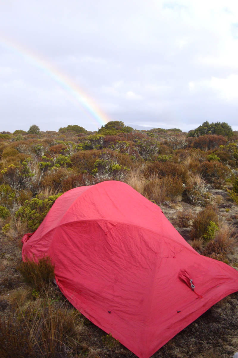 DSC04295 Published January 3, 2014 at 800 × 1200 in Round the Mountain Track (25-29 December 2013) ← Previous Next → A rainbow in the late afternoon while we were cosy inside the tent.