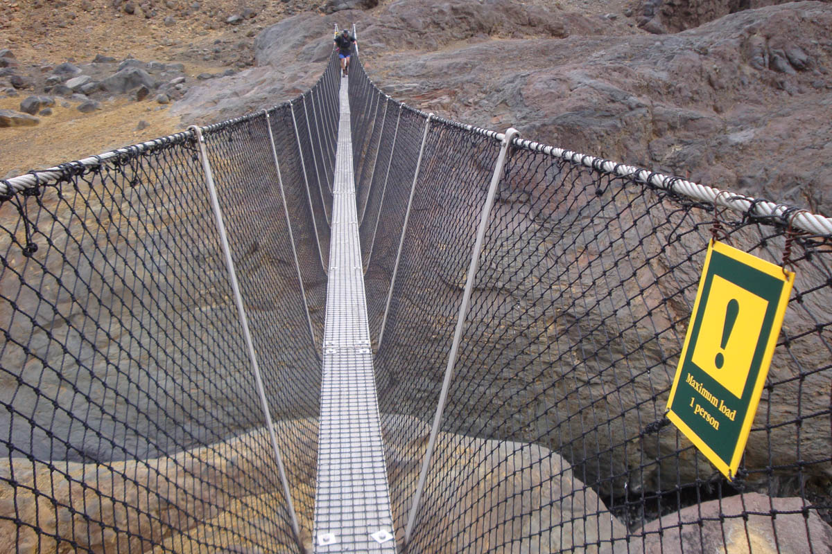 DSC04341 Published January 3, 2014 at 1200 × 800 in Round the Mountain Track (25-29 December 2013) ← Previous Next → Gerry crossing the first of many one person hanging bridges.