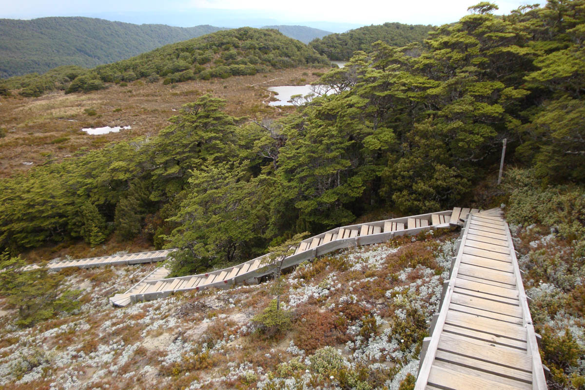 DSC04462 Published January 3, 2014 at 1200 × 800 in Round the Mountain Track (25-29 December 2013) ← Previous Next → This staircase was constructed to protect the fragile alpine environment that’s been trampled by hikers. Lake Surprise in the back.