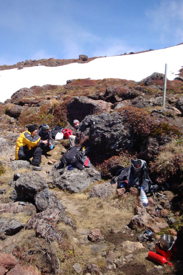 DSC05602 Published November 4, 2014 at 600 × 900 in Tongariro Alpine Crossing – 19.4 kilometres ← Previous Next → Quick lunch break, huddling between some rocks for shelter.