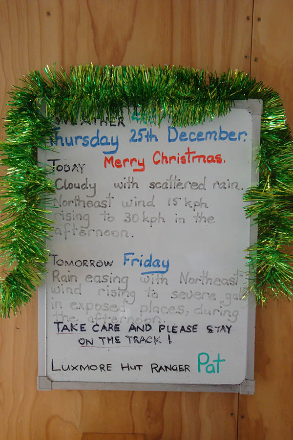 DSC06247 Published January 15, 2015 at 600 × 900 in Kepler Track – round #2 (24-27 December 2014) ← Previous Next → Appropriately decorated weather forecast inside the hut.