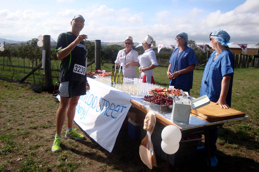 DSC06645 Published March 16, 2015 at 900 × 600 in Round the Vines ← Previous Next → The themed drink stations were so much fun. The nurses and doctors at this water point (Shortland Street) was giving sustenance by squirting wine with a syringe down the suffering “patients” throat. 😀