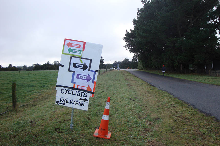 DSC06858 Published July 15, 2015 at 900 × 600 in Ignorence is bliss – Norsewood to Takapau ← Previous Next → No getting lost. This sign indicates the out-and-back section for the runners/walkers.