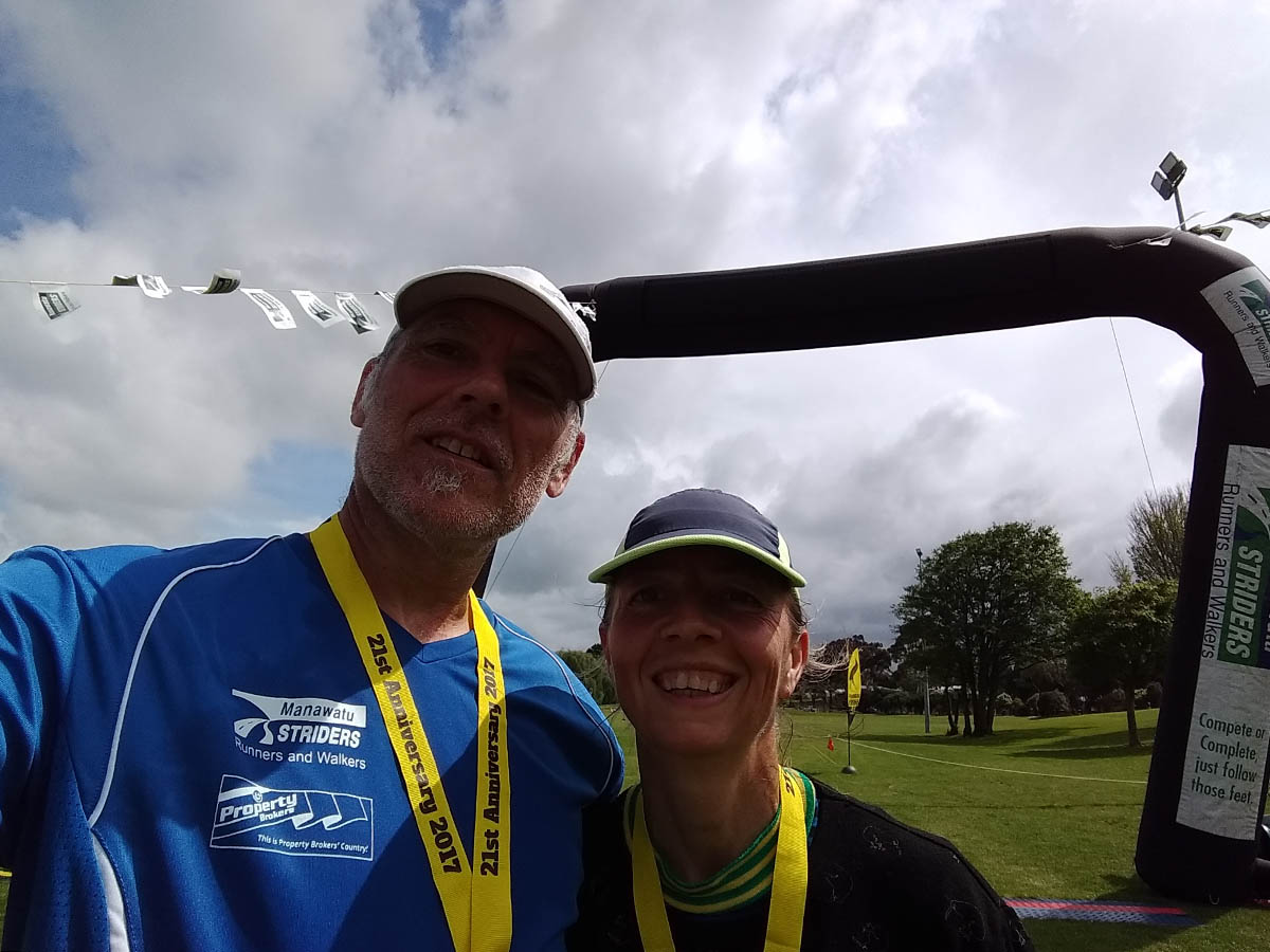 pic2 Published November 7, 2017 at 1200 × 900 in Roy Lamberton Memorial half marathon – Feilding ← Previous Next → Finish-line selfie, with the Striders start/finish banner a familiar backdrop.