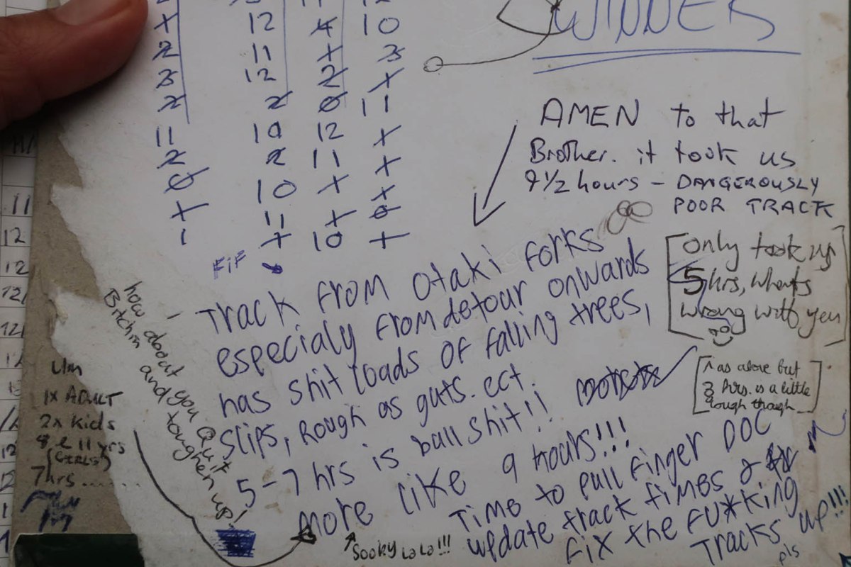 IMG_4532 Published January 6, 2020 at 1536 × 1024 in The treacherous Tararua Peaks Circuit ← Previous Next → Some angry comments in the intentions book.