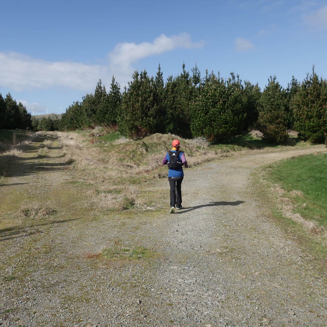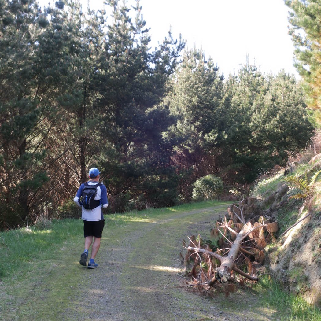 About 700m in, we reached a fork in the road. I checked my Topo Maps app, and saw that the road I thought we should take is quite a bit longer than the alternative. At this point I thought that the quicker we can get through the forest and onto North Range Road, the better. I was, however, uncertain about the alternatives as they didn’t look like proper roads. But as it turns out, they were just the same as the ‘main’ road. We turned right and after about 1k we reached another fork with the road veering off in three directions. Instinctively I thought the middle road to be the right one. Gerry suggested we go right as this road seemed wider and more like the correct road. I couldn’t disagree. After a few hundred metres, another fork made us once again question our direction, but when we reached the fence line of the windfarm still a few metres further, it seemed like the road was going in the wrong direction (heading back towards Palmy). Out came my phone and Topo Maps again, and so we backtracked to the fork where we went wrong, to take the middle road. Always follow a hunch. Haha.