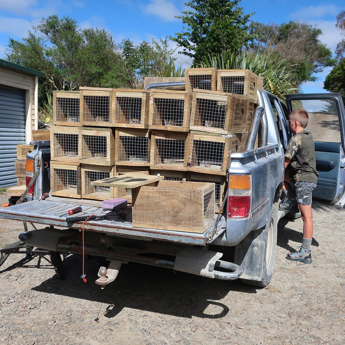 In the morning, we all (Nina, her son, and myself) met up with Ian in Ashhurst, from where we took his ute to his farm in the Pohangina Valley. Rows and rows of traps were laid out on his front lawn, which we wheelbarrowed to the shed for checking and adjustments. Every so often, the mechanism of a trap would be too close to the side, rendering it useless. But moving it a wee bit solves the problem in a tick.