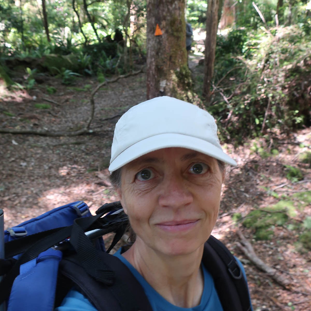 We collected six of the ten traps we left at the park entrance the previous day, for the trip up the mountain. And boy is this mountain steep. From the stream-crossing we walk the first very steep stretch to the junction (the same stretch we did the previous day multiple times), before heading left around the Deerford track. Although the track still goes uphill, it is not as steep as the first bit. But after this short respite to the junction on the other side of Deerford Track, the mountain climb starts in all earnest. The relentless uphill had us puffed (pooped!) and winded. It makes for slow going with the weight of the traps, but I think we did well, moving 15 traps into their resting places. Nina made three trips, and Gerry and I did two, while also baiting and setting the traps, and signposting their positions. A numbered pink triangle goes on a tree where the trap can be found, to make future check-ups and documenting easier. Each time something gets killed, it is noted on a website containing the network of traps, to keep up-to-date stats on the killings and progress. Quite cool, really.