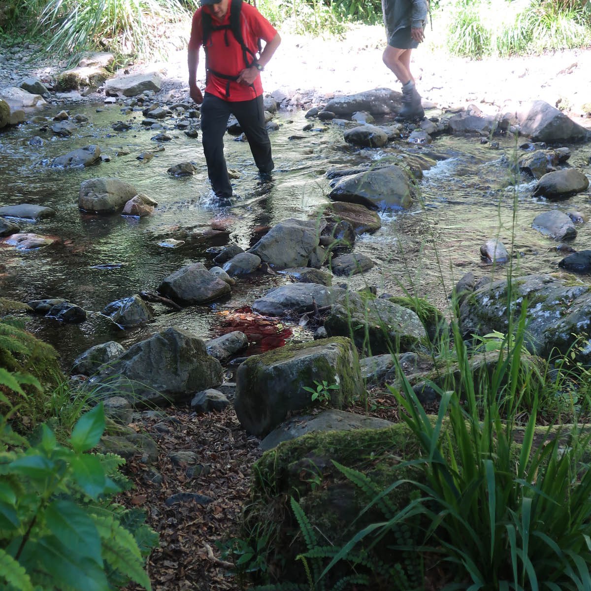 When we parked in the paddock, it was super windy. The sun was out though, and the gloomy weather prediction from the previous week, was fortunately a miss by MetService. As we walked down the farm track, it became evident that it might be a hot day. Down by the river, criss-crossing, getting properly wet, we got to the point where Nina and I had to start following the track. We dropped the packs with traps and were on our merry way.