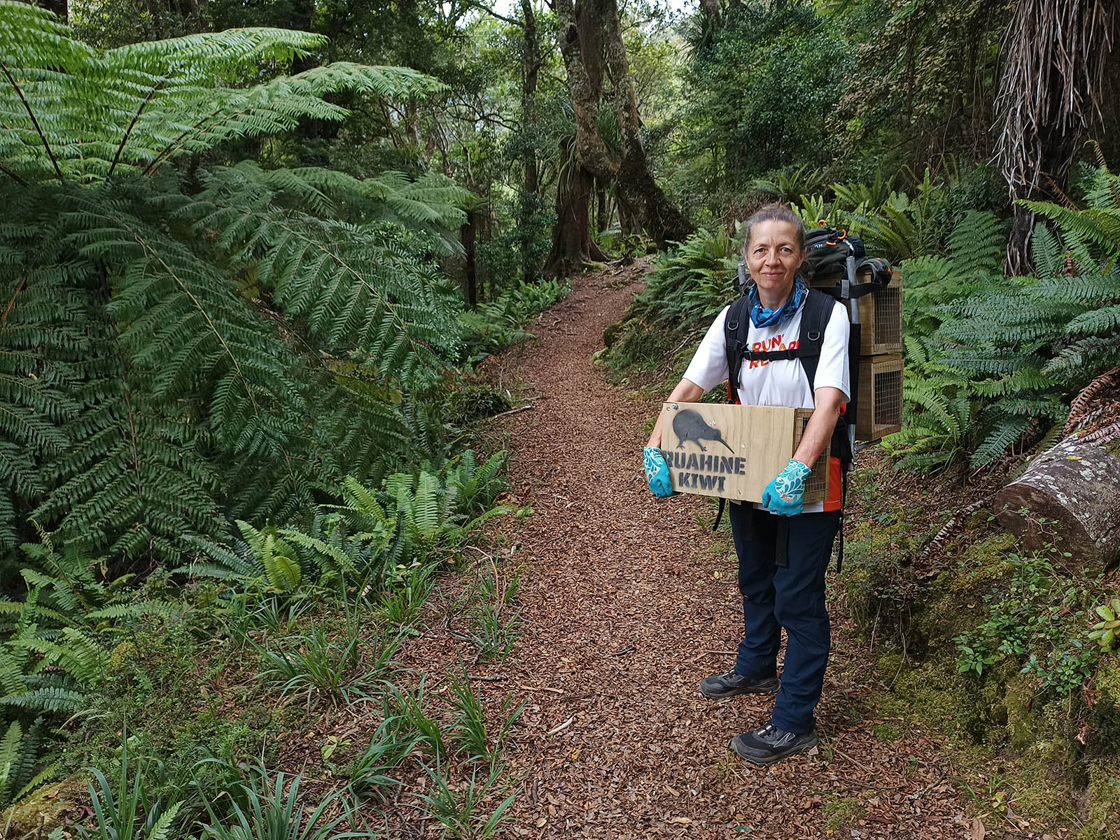 By lunchtime we were ready to get 40 of the traps into Knights Track, at the furthest northern edge of the project area. On the way, we stopped at local farmer Jim and Sandy’s. Sandy also run a horse trekking business in the area. Jim offered to take us through his property, which borders on the DOC land, shaving off a few hundred metres of carrying traps. Jim also offered to carry a few traps up to the junction on Knights-Shorts and Deerford Tracks, which was very helpful. We did three trips and managed to take 30 of the traps to the junction. The others we left at the forest park entrance.