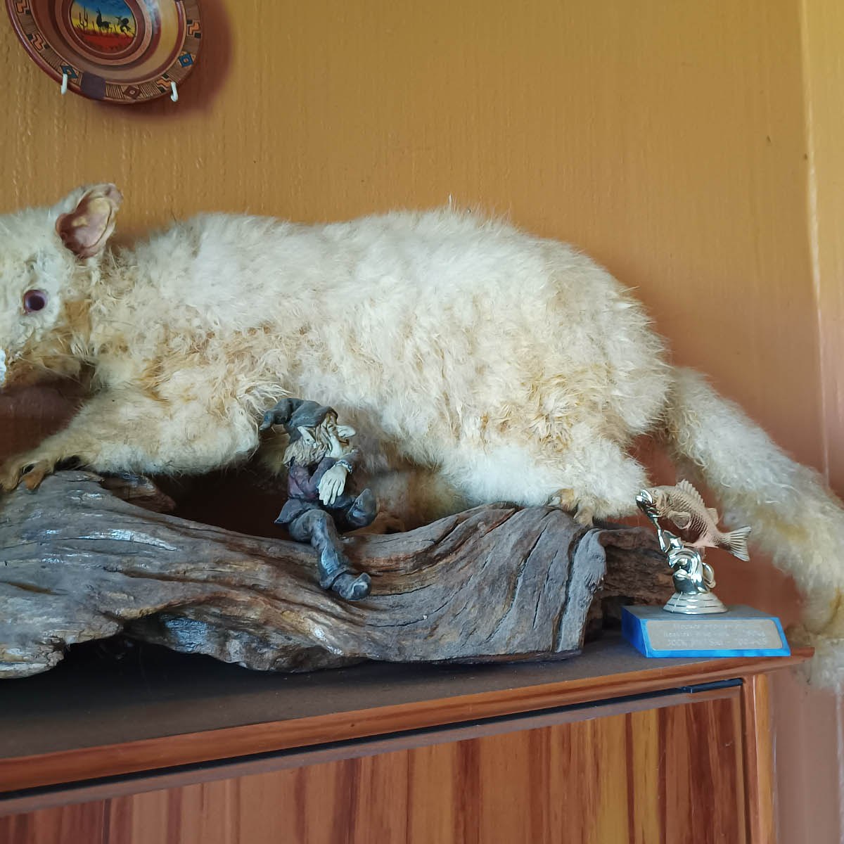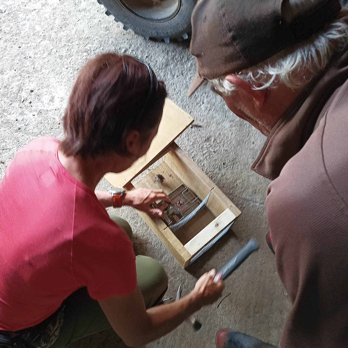 Some steep ups and downs, a few lessons in tree identification, and weeds and feed, and we had made it back to the farm house a bit after lunchtime. Jock gave us a few faulty traps that needed fixing, and showed us his fridge with deer that was shot recently.