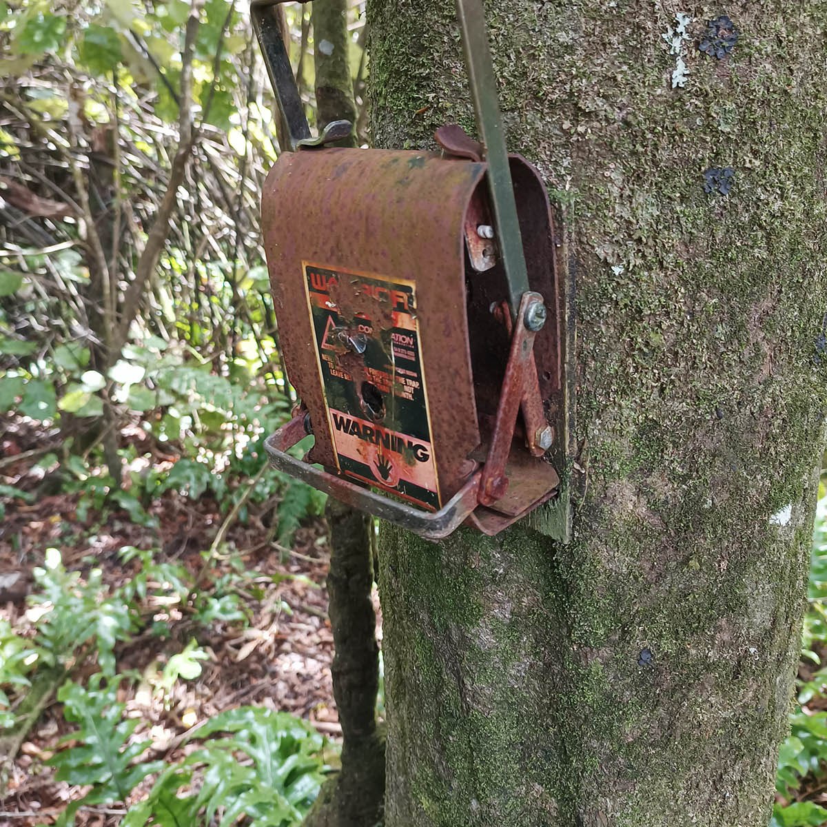 It is quite slow going, as the track is rather technical with heaps of fallen trees to clamber over. Not to mention all the stream crossings, slippery rocks and other obstacles. I managed to step on a slippery rock in one such stream-crossing and gave my shin a good knock on a sharp rock, which developed a massive bump and turned all shades of purple by the evening. Finally we reached the spot for trap number 17, our final destination for the day. We turned around and on the way back, baited, set, and tagged all the traps.