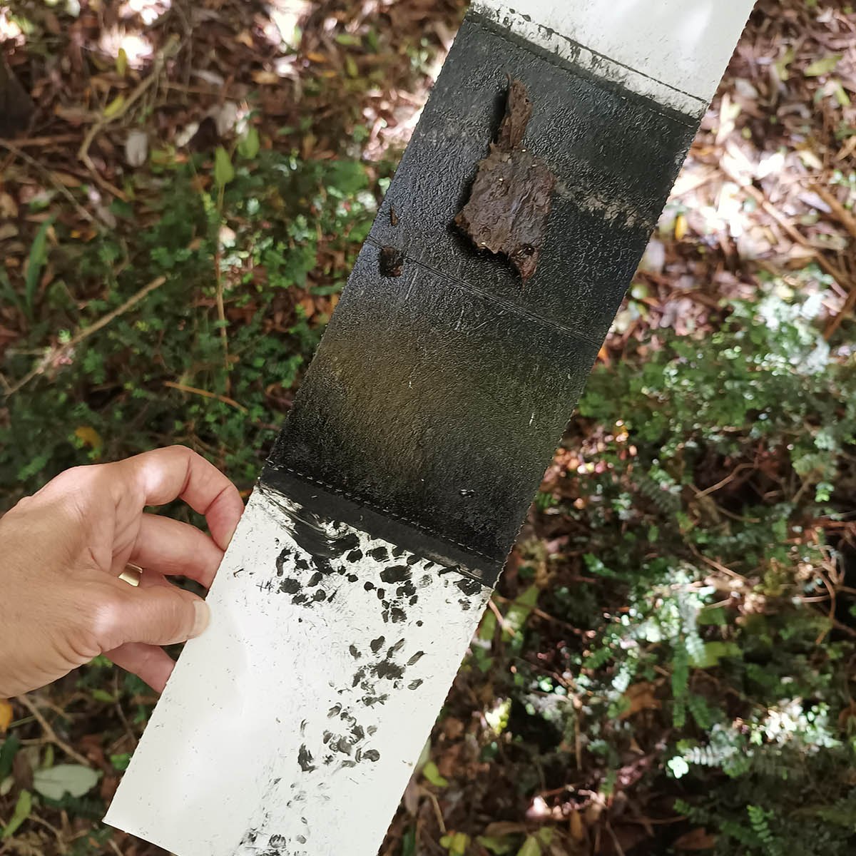 After placing the last monitoring card, we went around Deerford Loop to check all the traps, but found no dead pests. Some traps were set off due to windfall – large branches landing on the traps, others were without bait (critters and mice probably got to it before anything else could). We reset and rebaited everything that needed attention with dehydrated rabbit before returning to the car. The drizzle became a bit more persistent, and by the time we took off our wet rain clothes, shoes and socks in the carpark, it was raining.