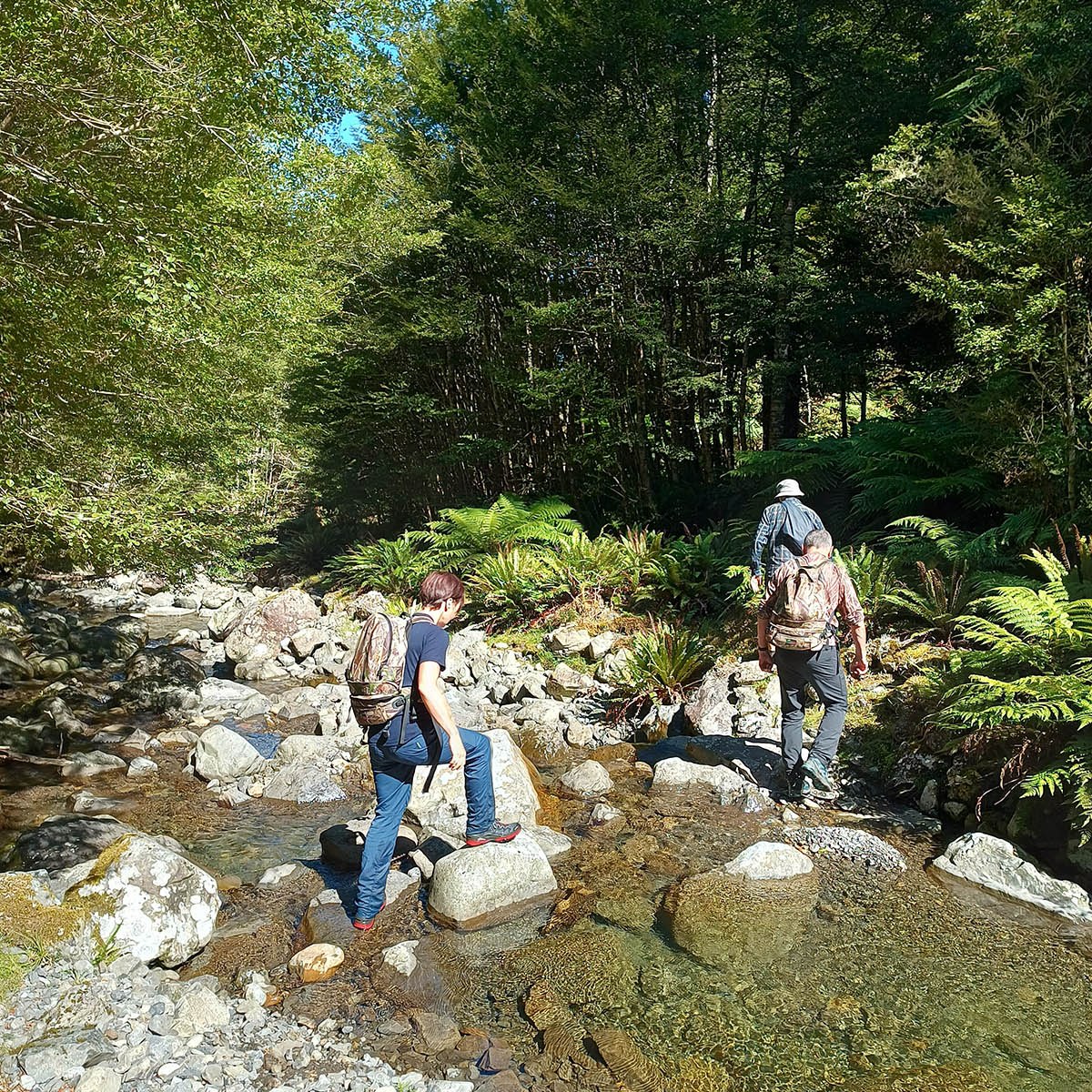 We parked the ute and started walking the line not far from Jim’s private hut. The first section is through the forest and down into the valley to follow the stream. As usual, we criss-crossed through the water going upstream while stopping and checking a trap every 100 metres.