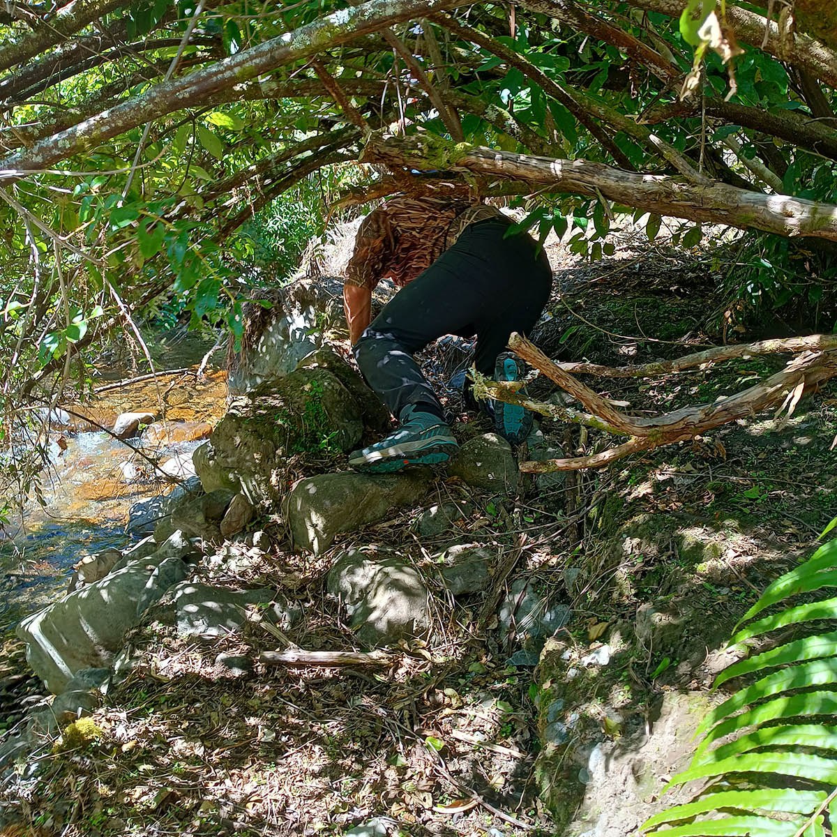 Not too long after, we reached the far end of the line and turned around to return the way we came. This trapline remains a mystery to me, and I know it will take me three times as long to find my way up and down the creek. With slips, fallen trees, side streams, and little waterfalls, you have to know your way to be on the right side of the stream for each section. Due to all of this, we cross the stream all the time to find the best path. Fortunately Jim knows this valley like the back of his hand, and despite often not walking the exact same route, he always finds the exact spots where we need to cross the stream, or clamber in or out.