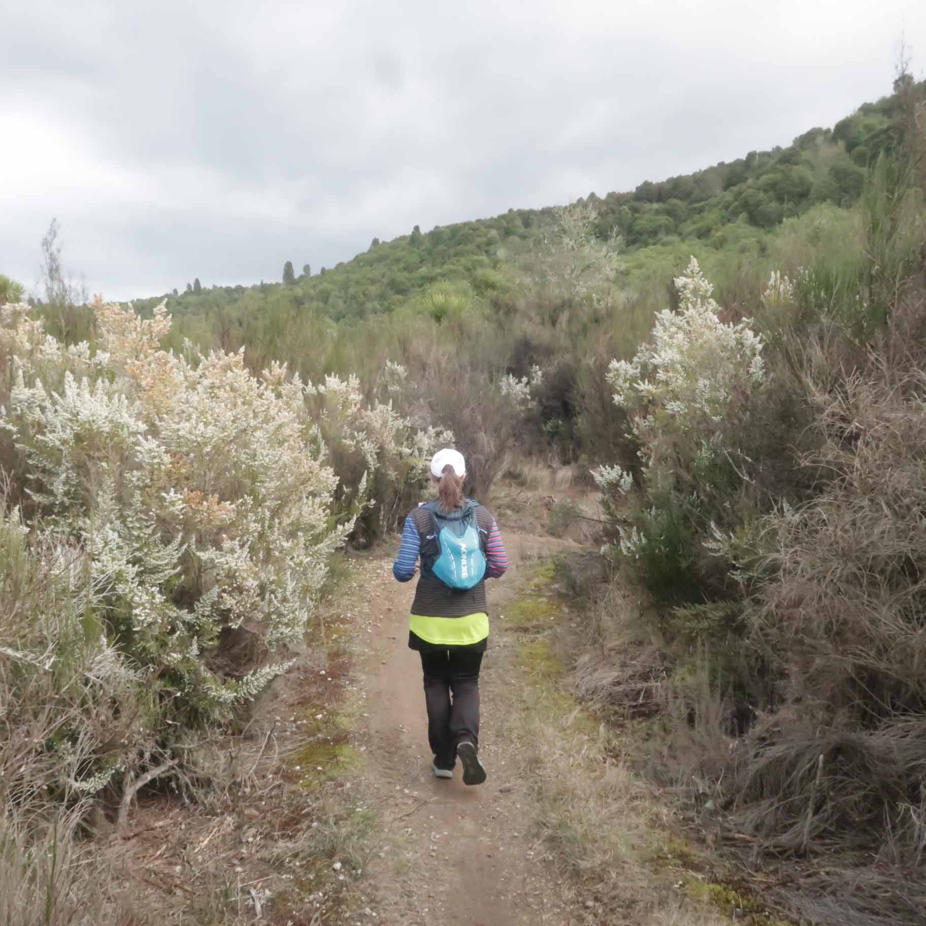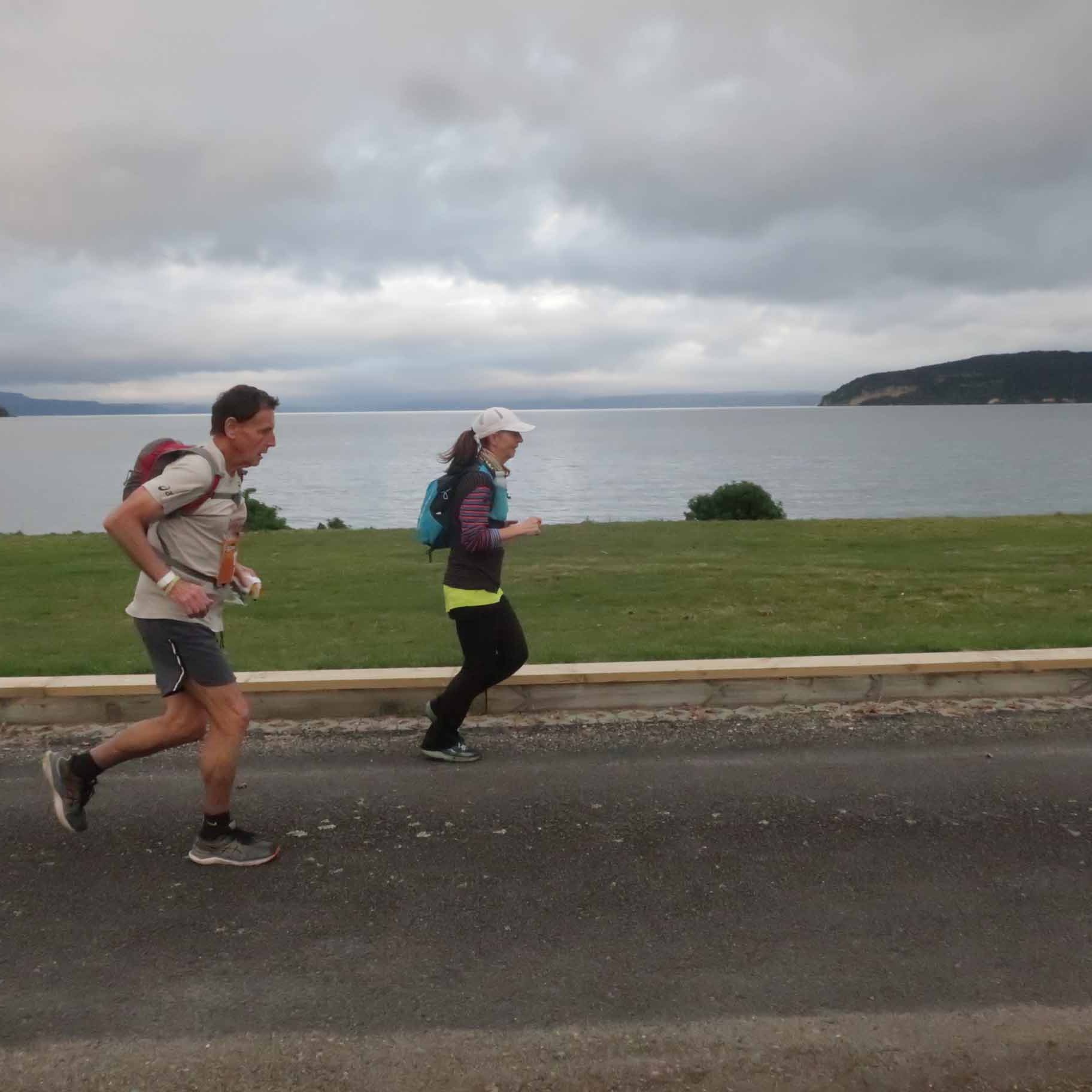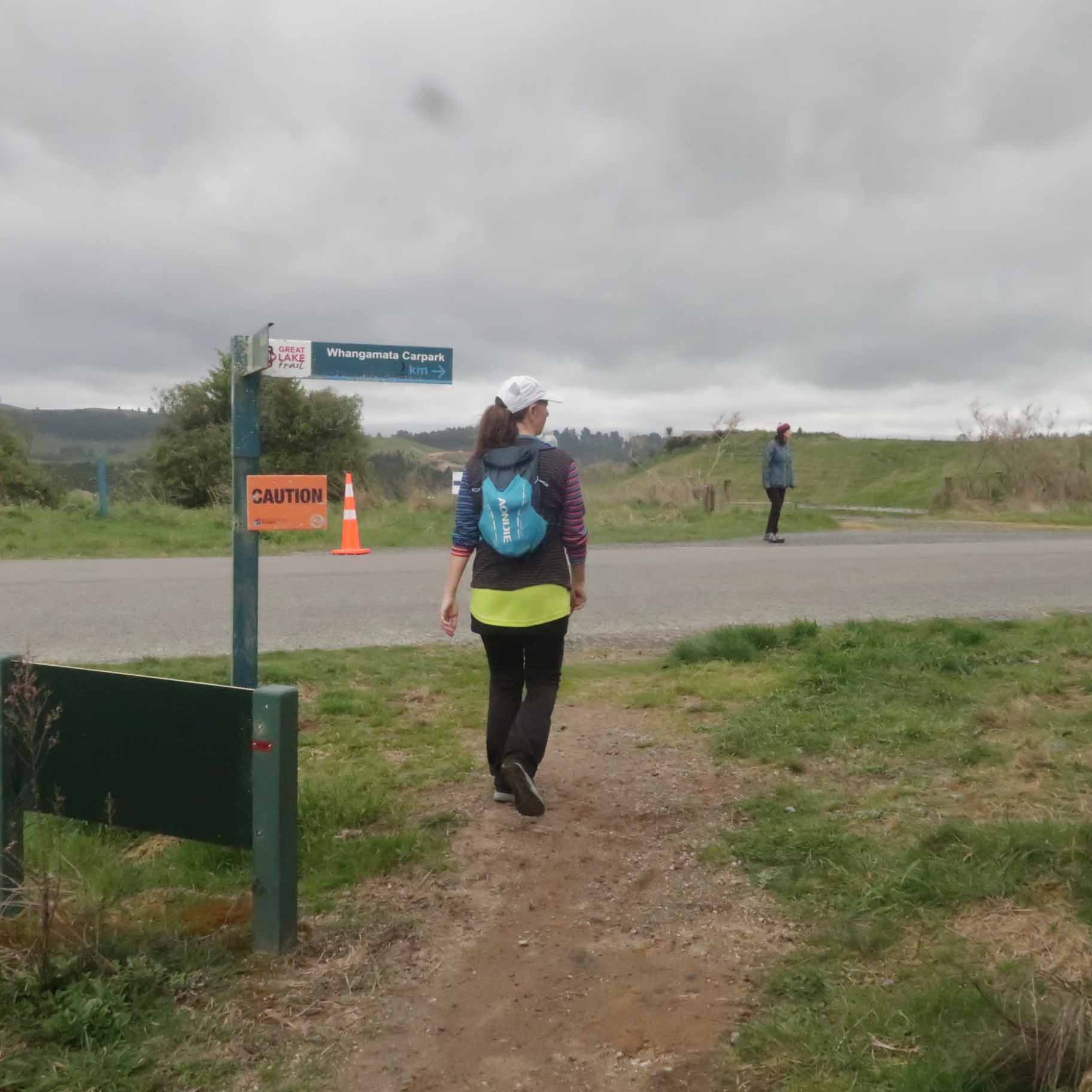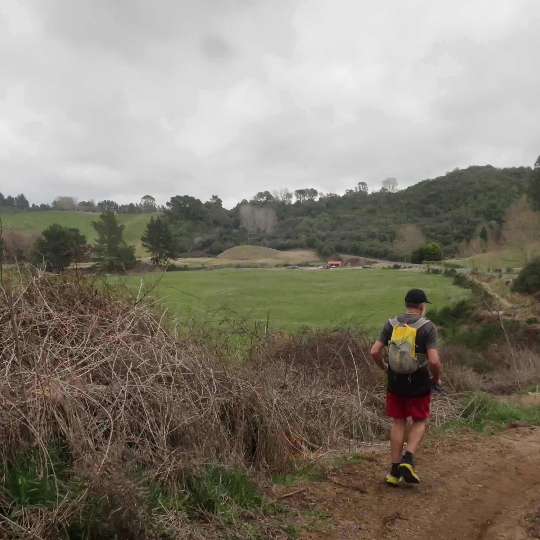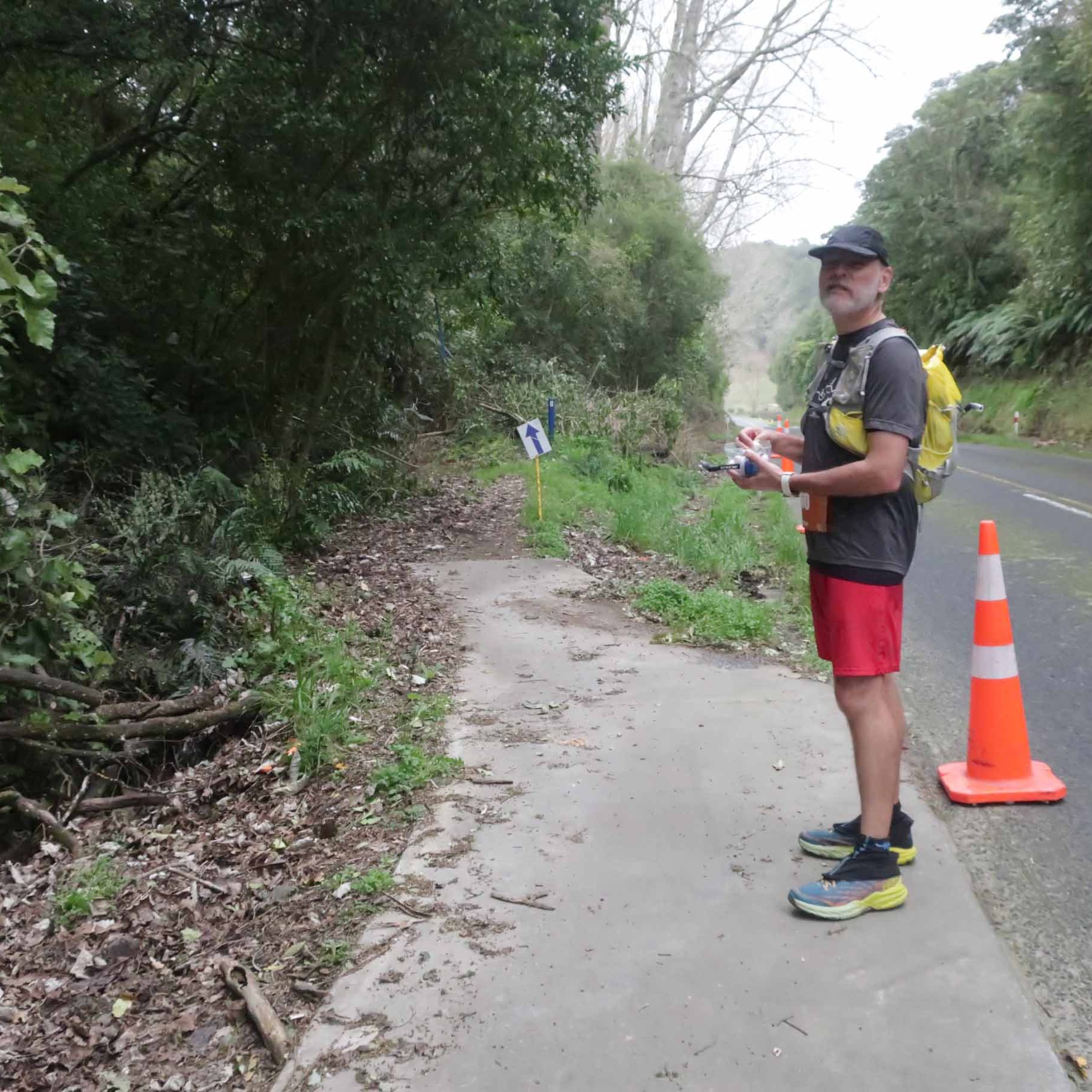 Turning back onto the track and following it for a few hundred metres, we reached the second aid station at the Orakau car park at the halfway mark. At the halfway aid station we filled up my two and Gerry’s one water bottles with electrolytes and water, shared one tiny piece of banana (they were still meant to cut more) and had a few crisps, before heading off. After a few hundred metres, we reached the loo where I popped in while Gerry put on his arm warmers and gloves. This made a world of difference in his overall temperature, and he looked comfortable again.