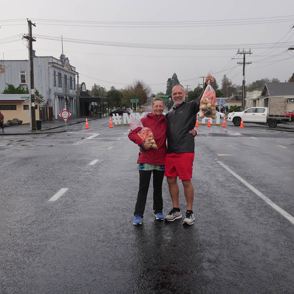 I started to slow down a bit, but still kept the pace in under seven minutes per kilometre, until we hit the hilly stretch in the second half past the rail road. Every here and there I had to walk short bits to get up the hills, but I was surprised to be able to run most of the way. Near the air strip, I was going slower than I hoped. This carried on until the finish, with more walk breaks, even on the flats. At the finish, Gerry’s name was called to collect a spot prize. Unfortunately it was for a massage or something in Central Hawkes’ Bay, which he would likely not use, so he returned it, to which they gave him some tomato fertiliser! We’ve got fertiliser the very first time we did the event in 2011, and I always love a good practical spot prize.