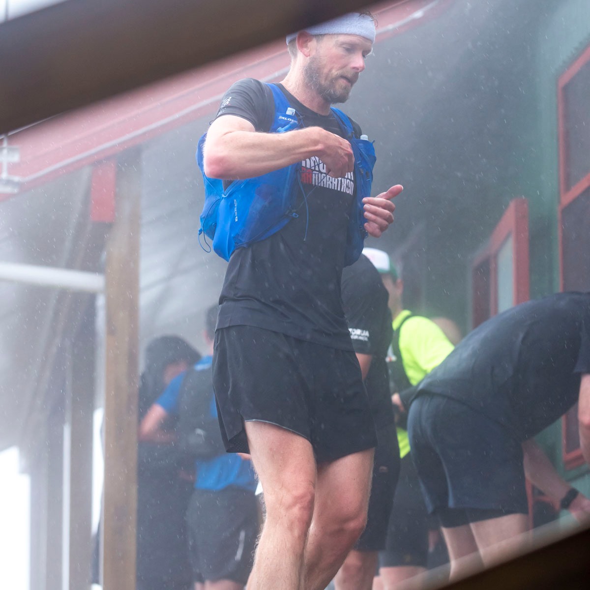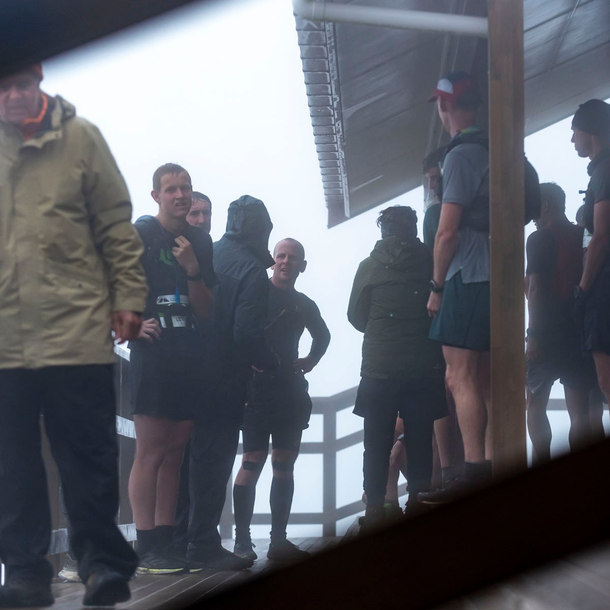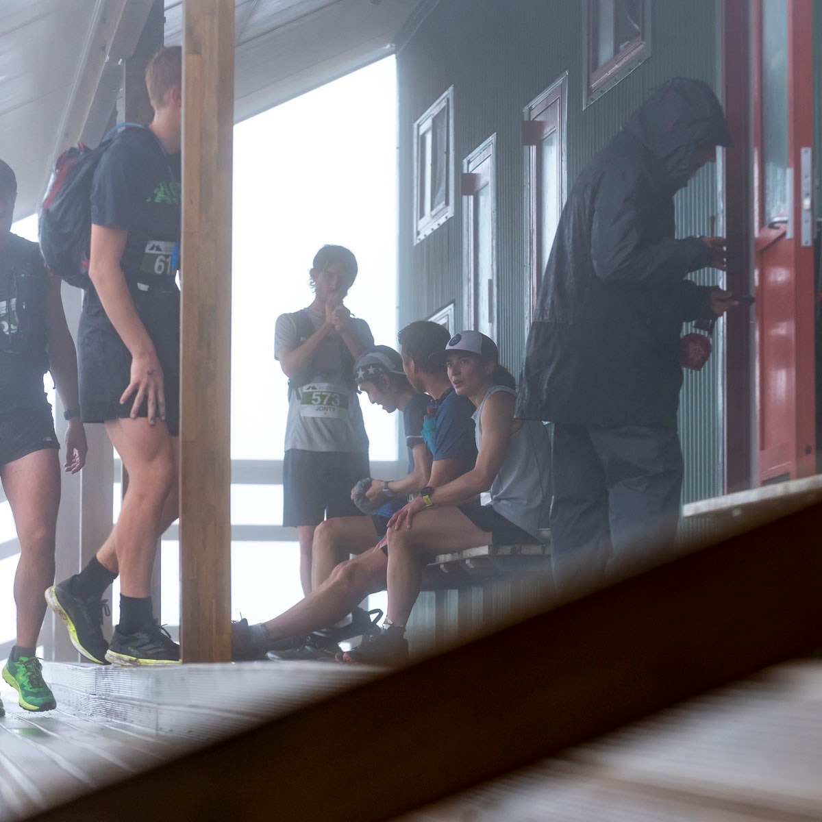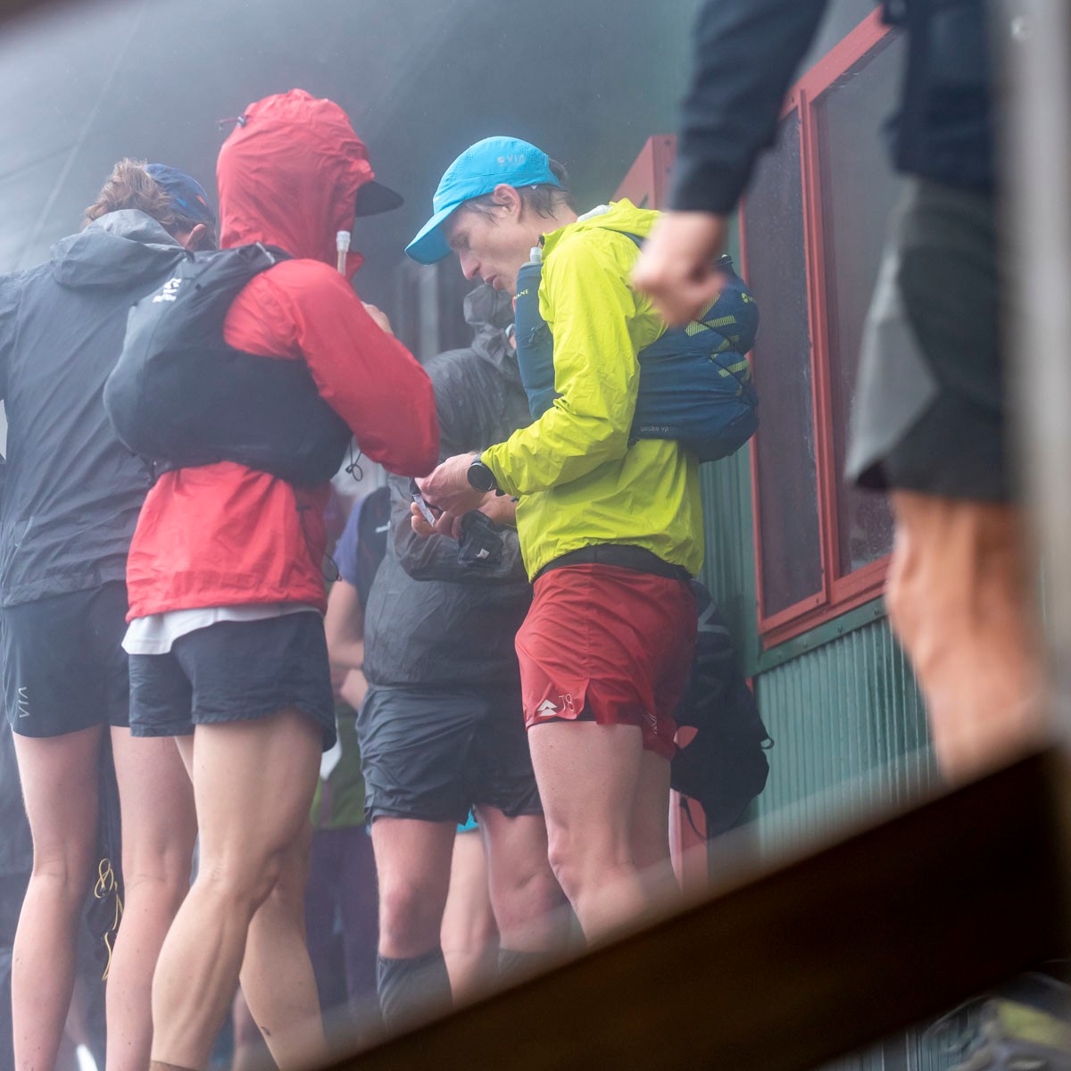 Getting ready for the first arrivals, we put on thermals and puffers, beanies, buffs, rain jackets and rain pants. We sorted the camera, and I took shelter in the wood shed, ready to shoot some runners. With the clag, rain and generally poor conditions for photos, I wasn’t hopeful, but figured I might at least capture something of the action and drama as it was unfolding on the porch of the hut.