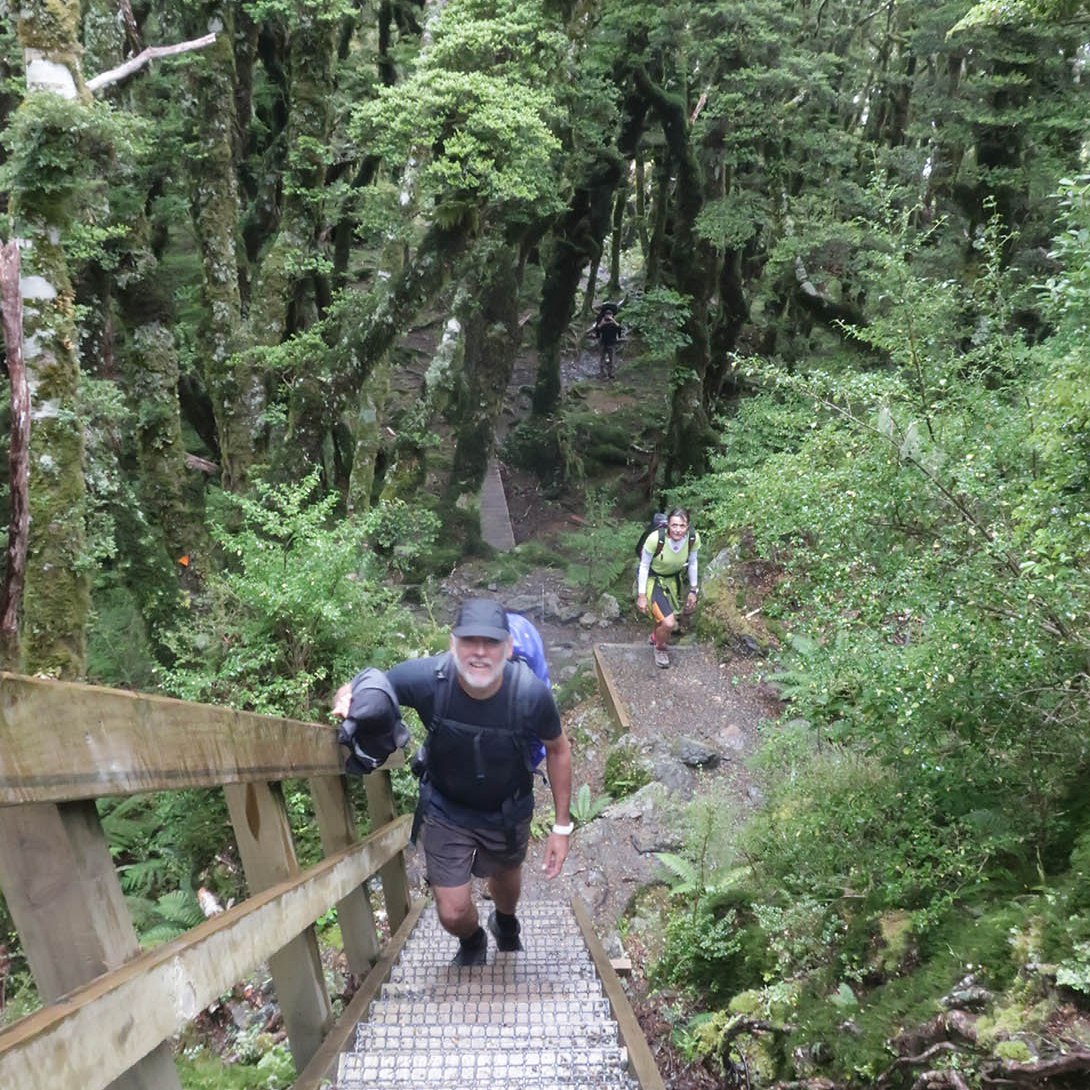 We made a last cup of coffee, packed up and started heading down the mountain. Suzanne followed suit, and caught up with us within the first couple hundred metres. With everything being wet, puddles of water and some mud, we took the first very steep section slowly. Back at the Mountain House Shelter, we had a quick break and a bite to eat, before continuing down the mountain.