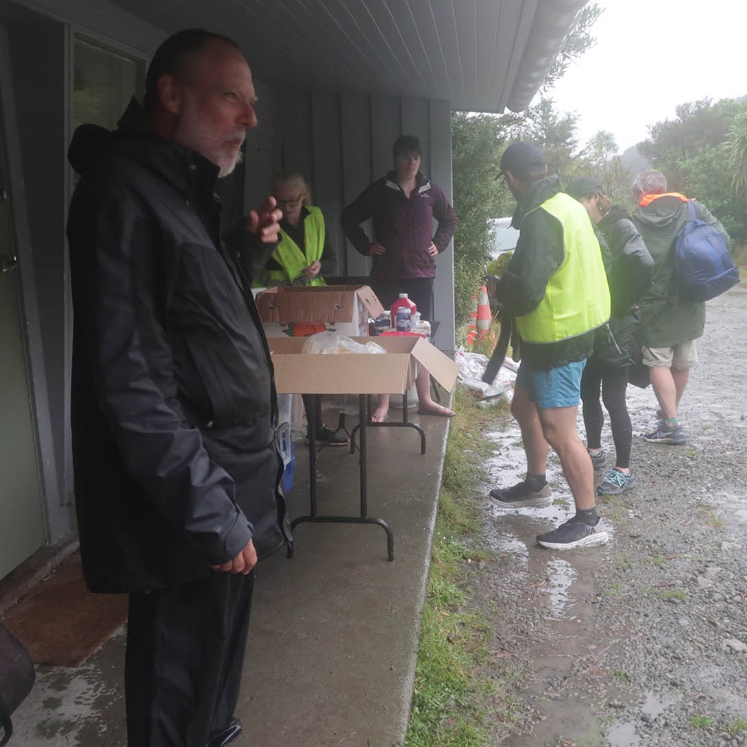 Like wet chickens the first runners started to arrive. Using a stopwatch, Gerry was taking their times while Carol recorded their numbers. Some put on more layers, others filled up their water flasks, before heading further up the mountain to the ridge where Suzanne and Tony were. By now they had some time on the top to evaluate the situation. And taking a walk in the gale and sleet, Suzanne opted to make the call that the race be called off. It was dangerous in the super wet conditions to traipse along the ridge in gale force winds.